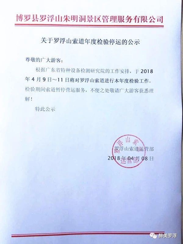 根据广东省特种设备检测研究院的工作安排,于2018年4月9日~11日将对罗浮山索道进行本年度检验工作,检验期间索道暂停营运服务,不便之处敬请广大游客获悉理解!