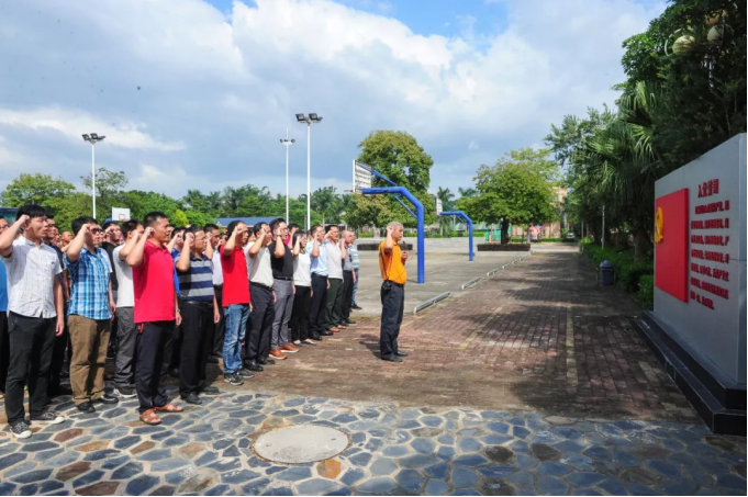 ▲在廉政教育基地广场上,面对党旗,在郭瑞民同志的领誓下,罗浮山景区全体党员举起右拳,庄严宣誓。