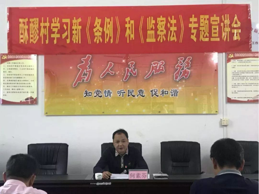 10月30日上午,县纪委驻罗浮山景区纪检组组长何素芬同志到罗浮山景区酥醪村开展学习《中华人民共和国监察法》和新修订《中国共产党纪律处分条例》宣讲活动。酥醪村两委干部、酥醪村党员、各村小组组长、驻罗浮山景区纪检组工作人员等52人参加了本次活动。