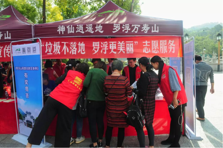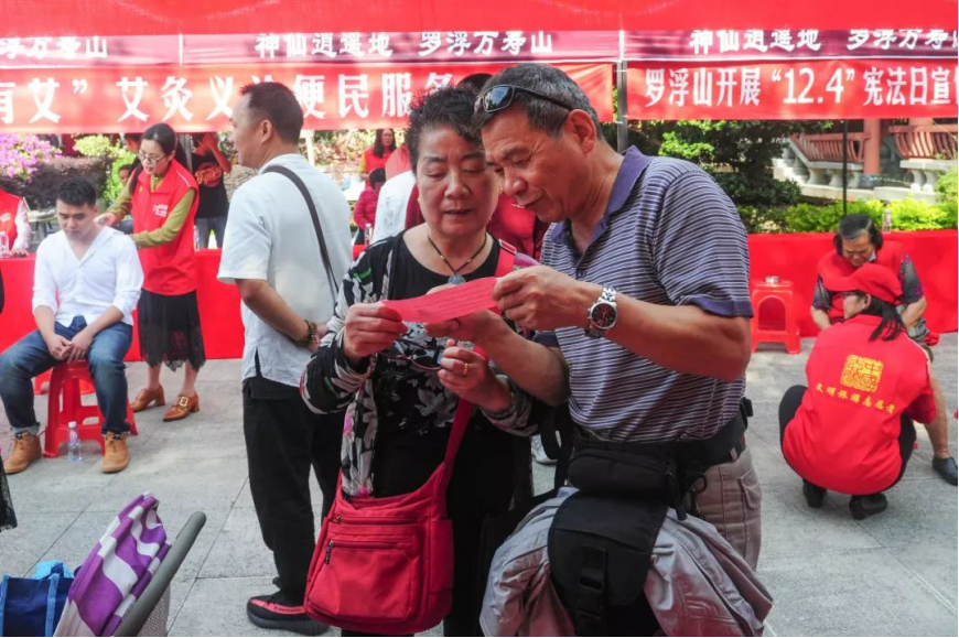 在启动仪式现场,一系列的志愿服务活动吸引了周边群众和景区游客的积极参与。艾灸义诊、《罗浮山风景名胜区条例》宣传与有奖问答、垃圾不落地环保活动、法律政策宣传,各色活动尽管主旨不同,却都一样地接地气、有亲和力,既为群众和游客提供实际的便利,又做到了寓教于乐,在欢声笑语中传播了罗浮山中草药文化的魅力,普及了爱护环境、遵纪守法的正确观念。