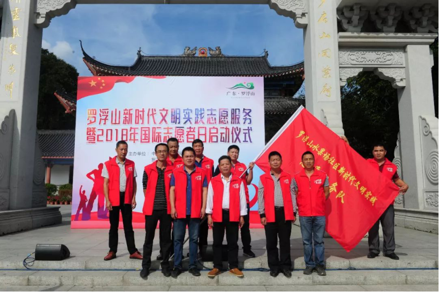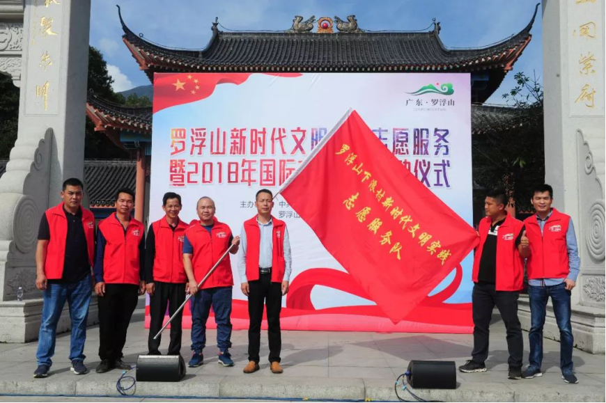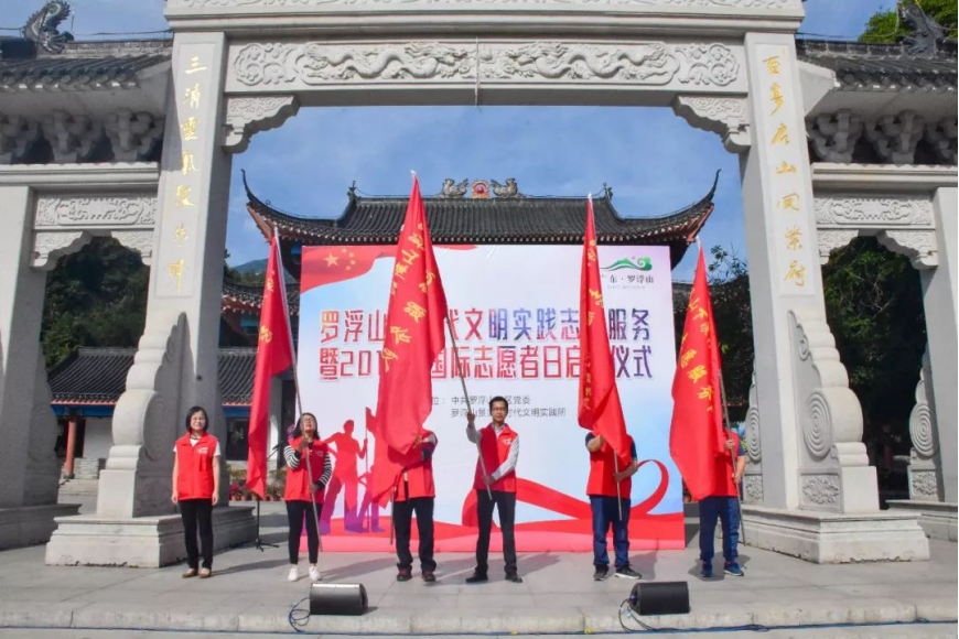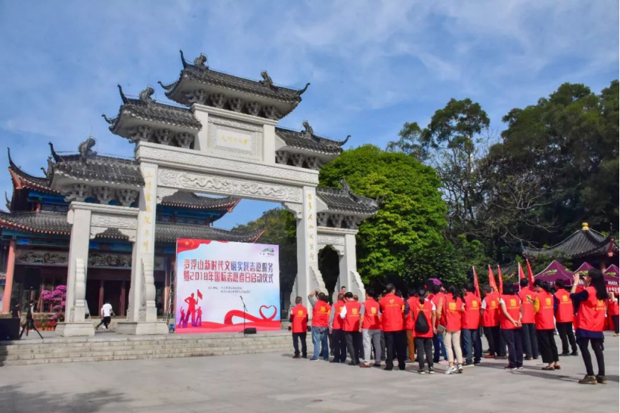 12月4日上午,罗浮山举行新时代文明实践志愿服务暨2018年国际志愿者日启动仪式,景区党委委员、管委会副主任沈文芳同志,旅游公司党总支书记、景监大队队长苏启来同志,各村(社区)志愿者服务队代表,管委会全体党员干部及社会志愿者共约100人参加了活动。