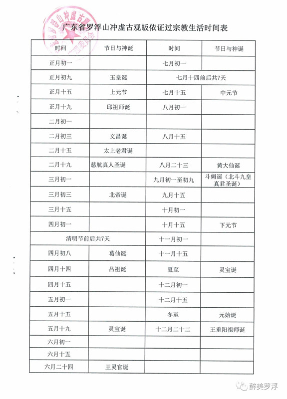 附:《广东省罗浮山冲虚古观皈依证“宗教生活日”时间表》