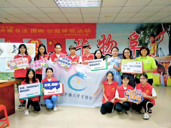 国画书法活动结束后,由龙华镇大学生协会代表上台进行了"把我的大学讲给你听"分享,将大学生活与自身的学习经历与在场的孩子们分享,并采访了孩子们未来的理想与对大学的向往,激励他们努力学习。