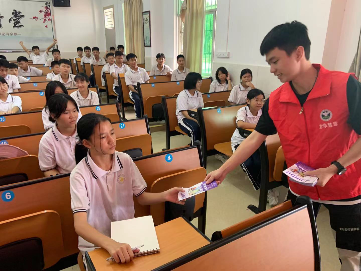 讲座结束后,工作人员还向同学们发放了各类禁毒宣传单,并倡议广大青少年学生们一起高举右手郑重宣誓“珍爱生命、拒绝毒品、从我做起”的禁毒口号。活动现场氛围活跃,同学们积极踊跃抢答禁毒问题。