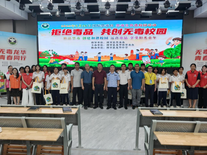 在第38个国际禁毒日到来之际,为了进一步科学普及禁毒知识,提高青少年学生“珍爱生命,拒绝毒品”的意识和青少年拒毒、防毒、识毒的能力,加大学校禁毒宣传教育力度,创建无毒学校,6月26日下午,平安法治办禁毒组到龙华中学开展有关禁毒知识的禁毒课堂,镇党委副书记、政法委员刘永忠同志、平安法治办主任廖学文同志、龙华派出所教导员李秋杰同志、龙华中学校长梁国安同志、司法所所长何远辉同志、龙华中学副校长陈超贤同志、龙华中学德育处主任朱伟诚同志、龙华派出所民警叶少龙同志出席本次活动。