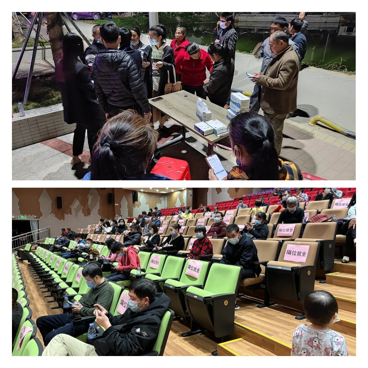 活动前,街道工作人员和村(居)工作人员、志愿者们按照疫情防控相关工作要求,指导群众做好配戴口罩、扫粤康码进场、隔位就坐等防疫措施,并引导群众有序入场就坐。