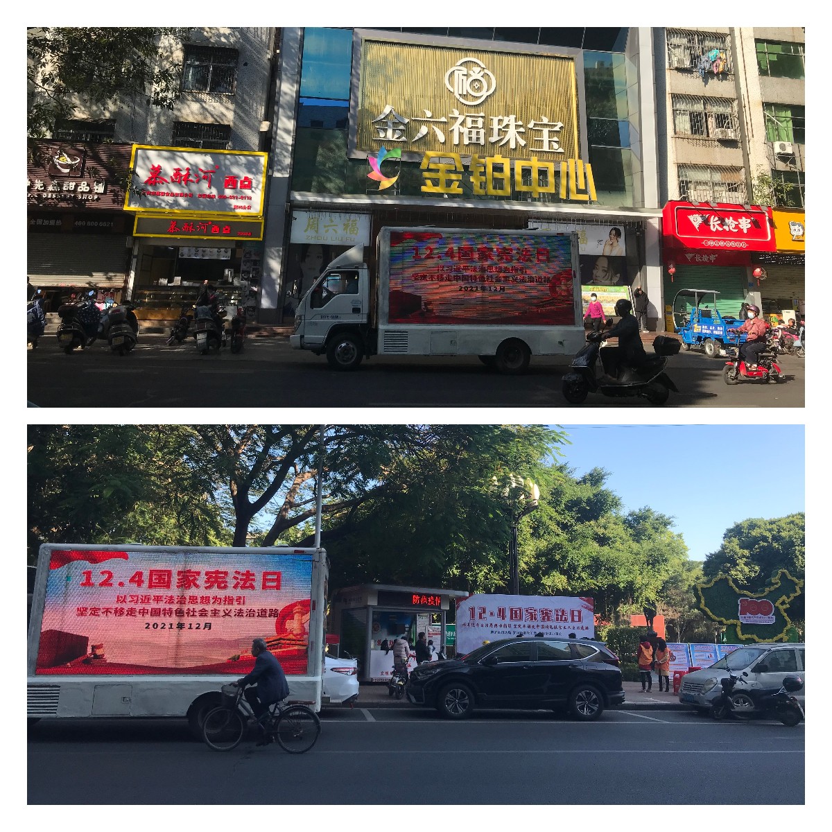 会场下配合LED宣传车进行同步宣传,在金铂广场、金田市场、万福达广场等人群流动较大的地点循环播报法律知识,让周边群众能够深入感受普法宣传的浓厚气氛,使他们对于法律知识的了解在潜移默化中得到熏陶,由此推动形成由上到下,由平面到立体的多元化普法宣传局面。