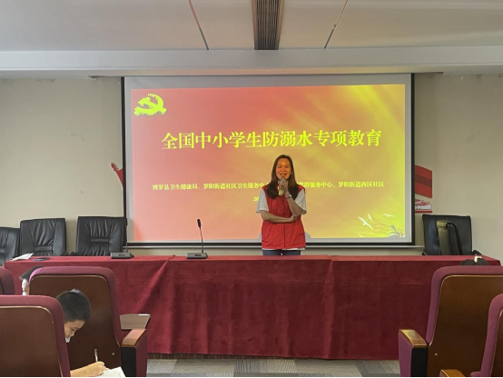 开展一次《夏季防溺水专项知识教育》活动。罗阳街道社区卫生服务中心邀请讲师,为小朋友们讲解防溺水知识,培养了学生安全意识,提高学生自救、自护能力,有效地预防和减少学生溺水事故的发生。