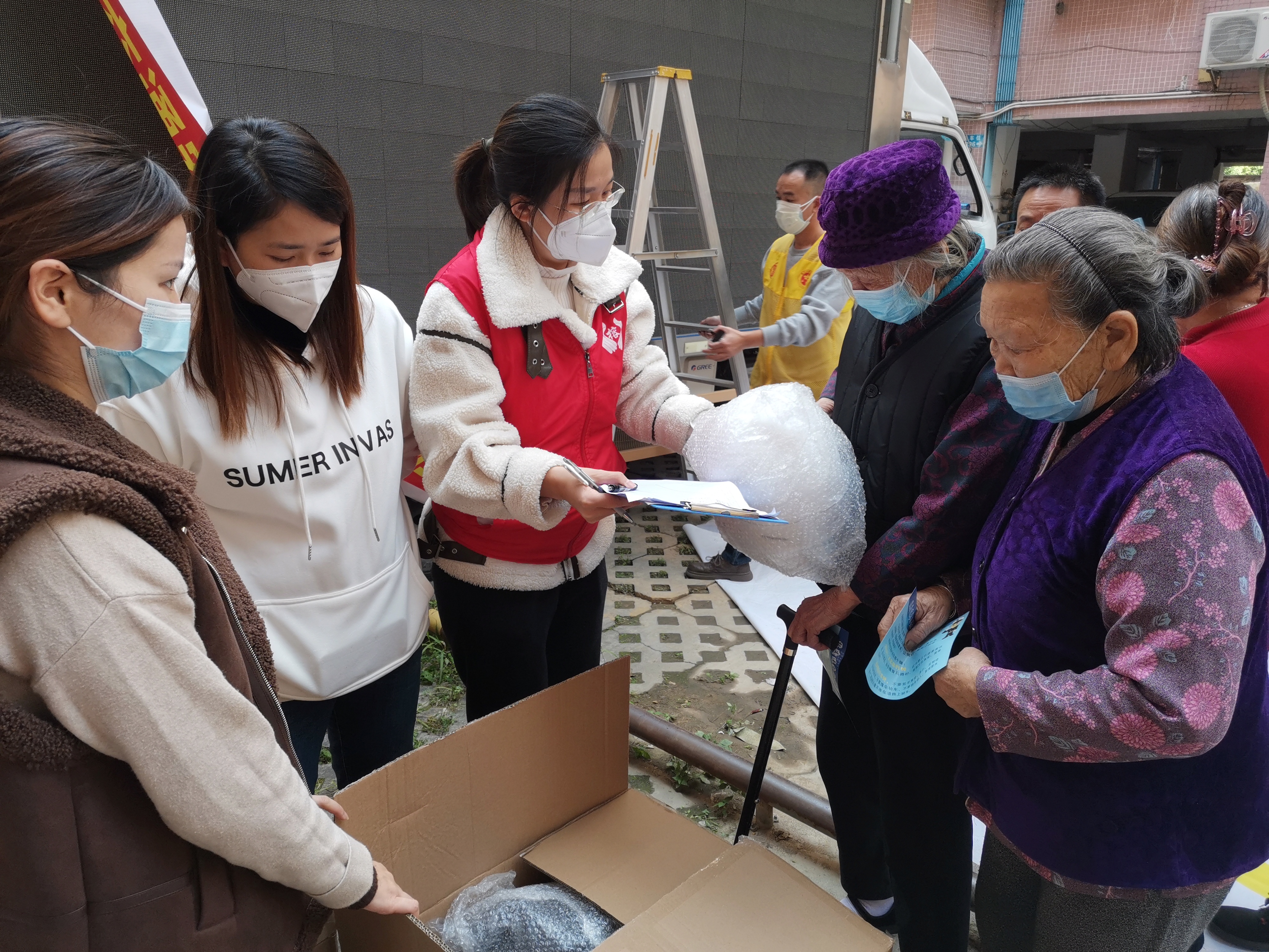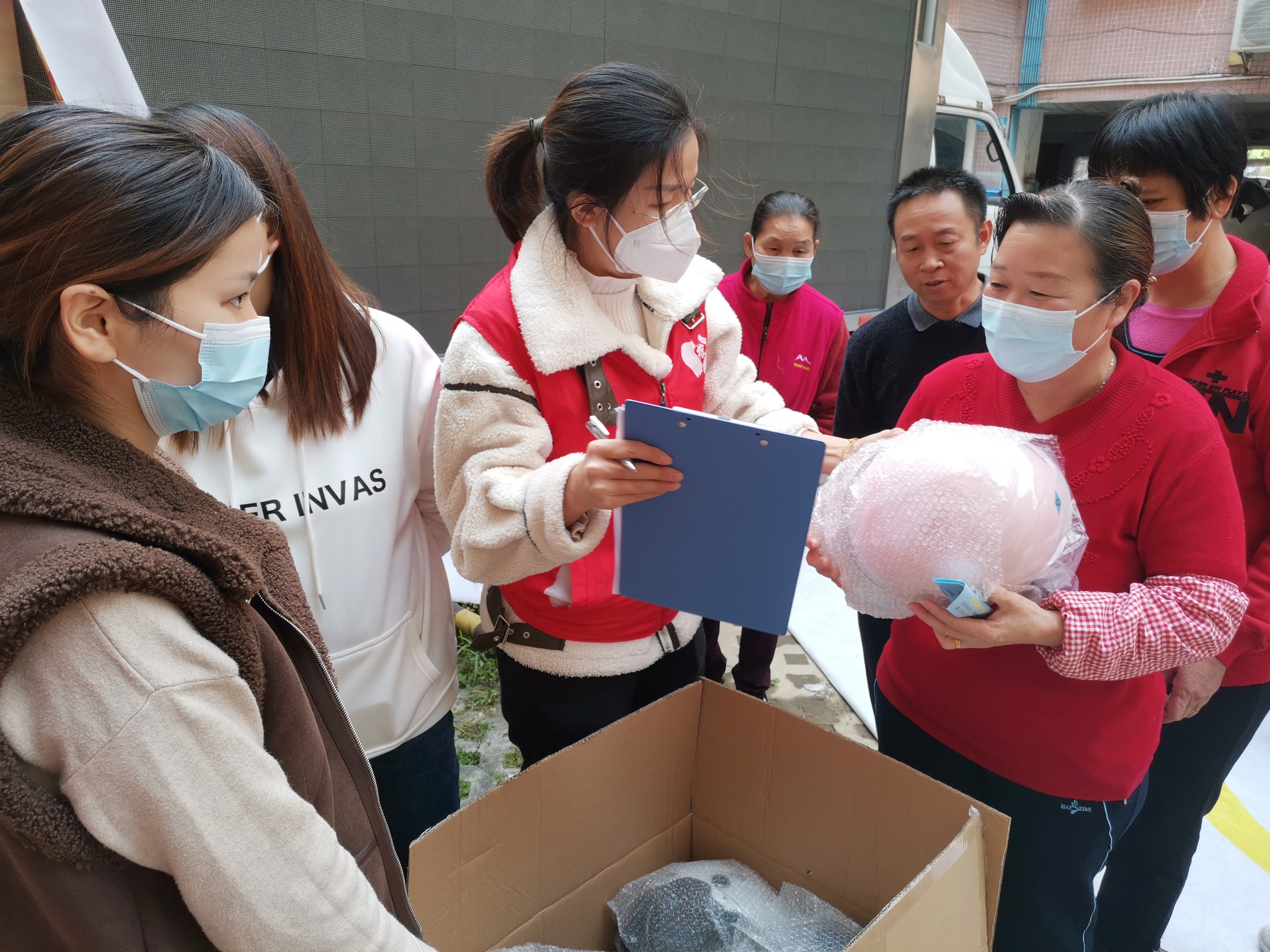 活动结束后,社工派发下沉部门赠送的爱心头盔,让居民有序排队领取。