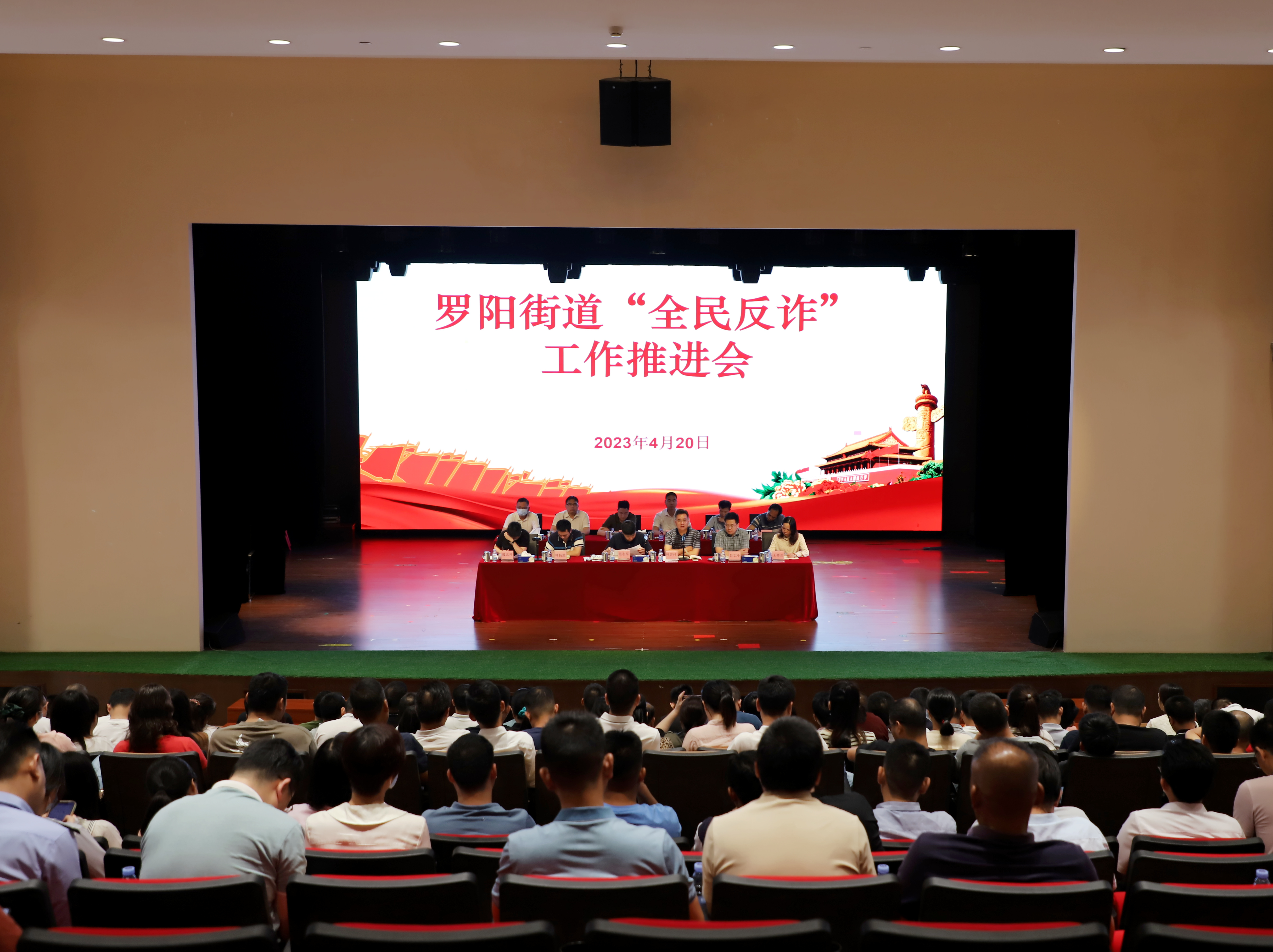 为进一步压实反诈政治责任,提高公众反诈意识、防诈能力,打造“全民反诈”“全社会反诈”新格局,4月20日,罗阳街道在江南社区影剧院组织召开了“全民反诈”工作推进会。街道班子领导成员,各部门负责人、包村(社区)组长、派出所所长、市场监督所所长、中小学校校长,各村(社区)书记、治保主任、储备干部等共约300人参加会议。