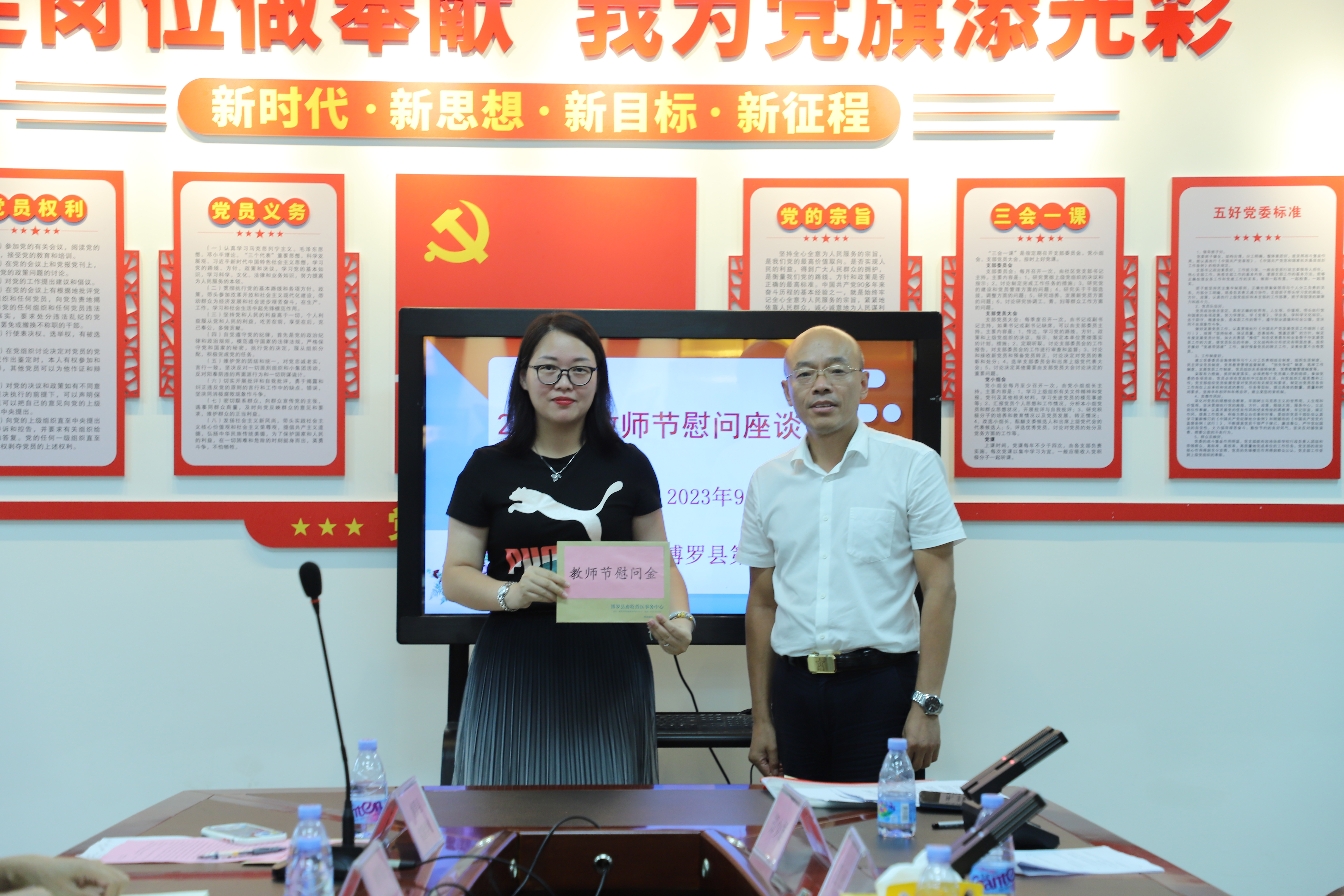 座谈会上,县第九小学、县第四中学、县第五中学(义和中学)、中文博彩平台实验学校等学校校长分别汇报了各校的办学基本情况、存在问题及下来的办学计划。随后,与会领导为教师代表送上慰问金并向他们致以节日问候和美好祝福。