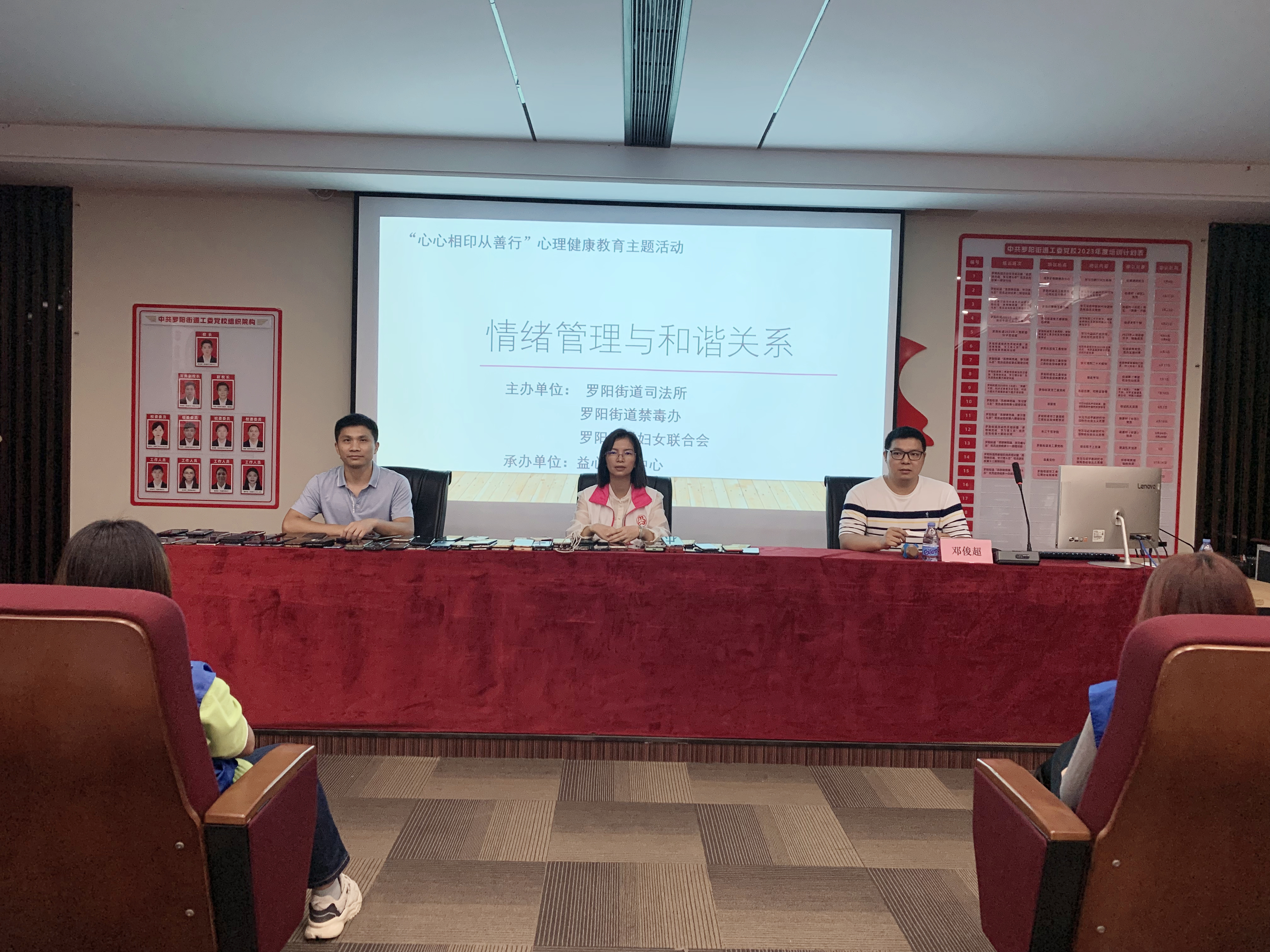 为加强社区矫正对象的管理,提高社区矫正对象的心理健康水平及识毒、防毒、拒毒意识,近日,罗阳街道禁毒工作组联合街道妇女联合会、罗阳司法所以及益心社工中心组织100名社区矫正人员在罗阳党群服务中心开展《情绪管理与和谐关系》为主题的宣传教育活动。活动邀请了国家二级心理咨询师邓俊超为大家授课。