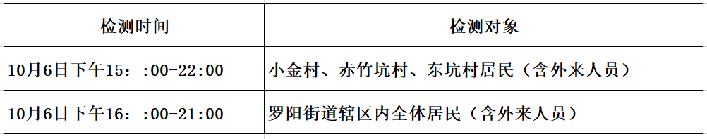 根据上级最新防控要求,罗阳街道10月6日(星期四)辖区内全体居民(含外来人员)的全员核酸检测时间调整为16点开采;小金村、赤竹坑村、东坑村居民(含外来人员)仍为15:00-22:00。罗阳街道于2022年10月6日至8日开展三轮全员核酸检测。在这三天里,每人每天必须进行一次检测。10月6日(星期四)具体检测安排如下: