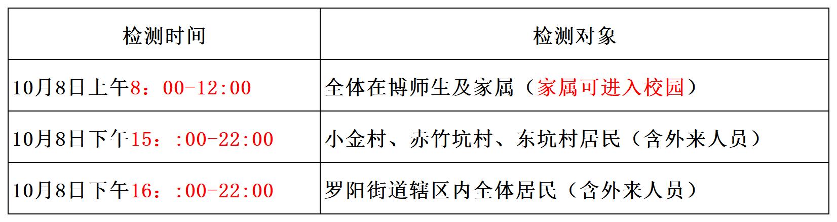 根据当前疫情防控形势,为加强主动排查,有效阻断疫情传播风险,切实保障广大群众身体健康和生命安全,罗阳街道定于2022年10月6日至8日开展三轮全员核酸检测。在这三天里,每人每天必须进行一次检测。10月8日(星期六)具体检测安排如下: