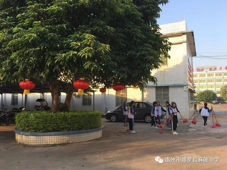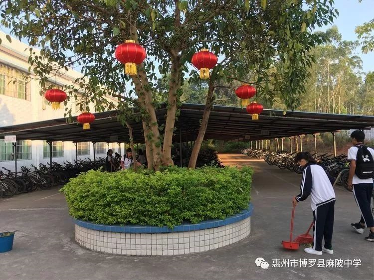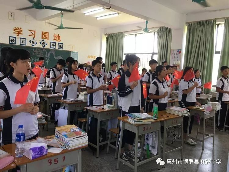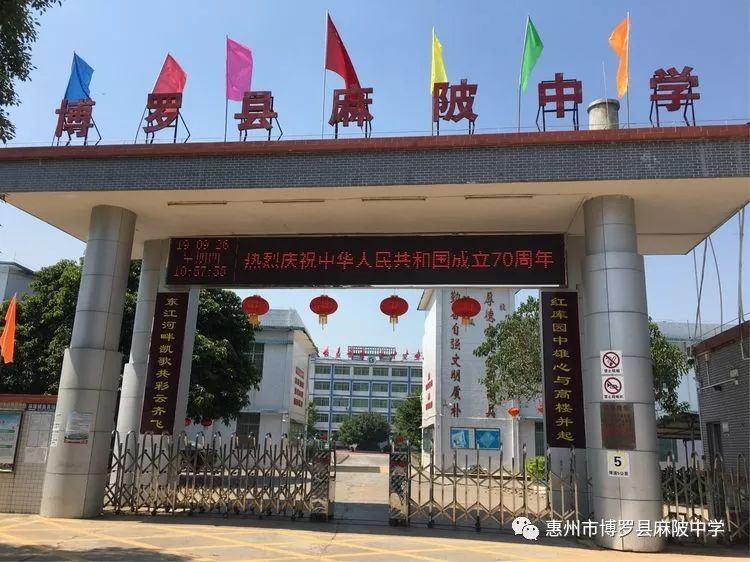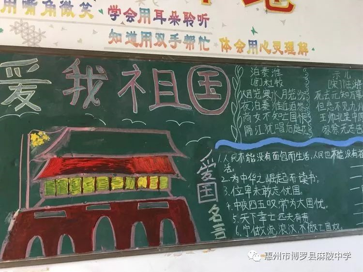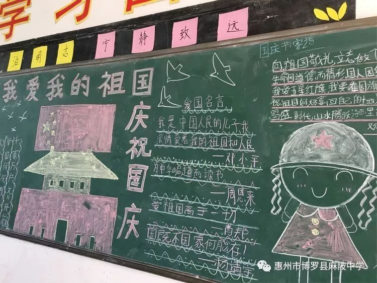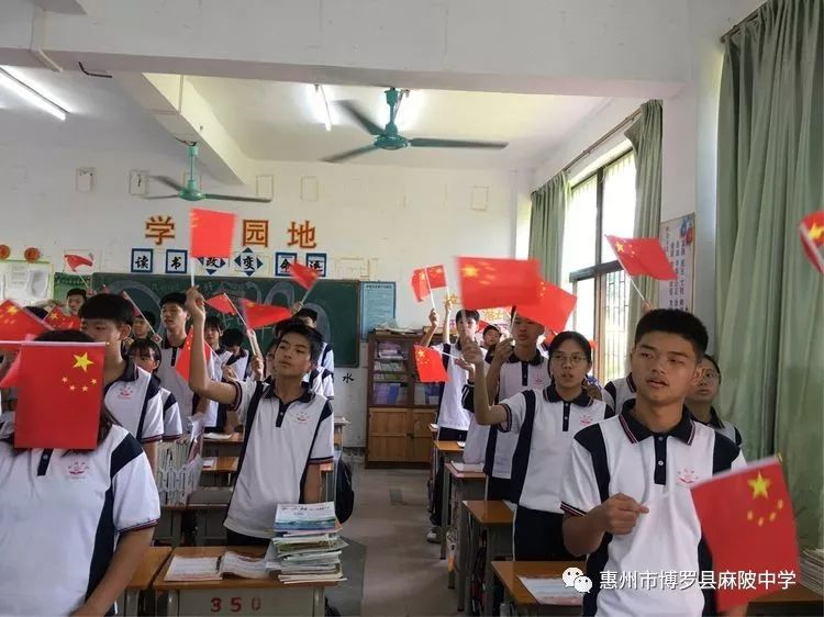 在将迎来中华人民共和国成立70周年之际,为激发学校师生的爱国热情,进一步加强全民爱国主义教育,麻陂中学积极营造庆祝国庆的氛围,校门囗及周边插满了彩旗和鲜艳的五星红旗,校园内的树也挂上了节日的红灯笼,校门的电子屏幕上显示着最为耀眼的字幕"热烈庆祝中华人民共和国成立70周年!"每间课室的黑板报上全是祝福中华人民共和国成立70周年的内容。在上学放学时间段也增设了"护校队"护学岗,保证国庆前后学校祥和安全。校园处处整洁,人人欢快,师生们脸上洋溢着幸福的笑容,整个校园满是喜庆的气氛。每位老师与学生以实际行动来共同表达对祖国的祝福和热爱。