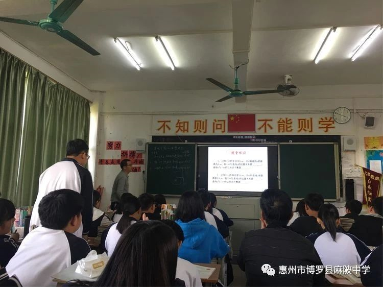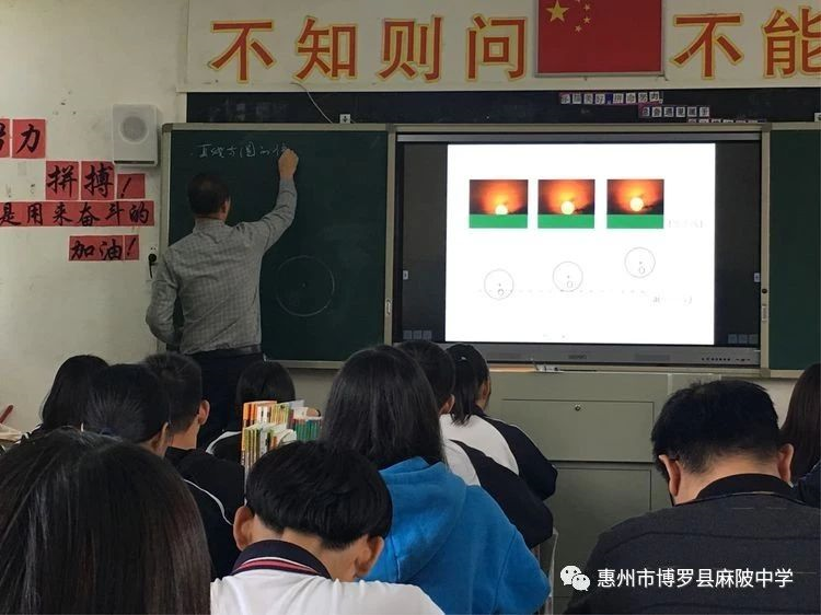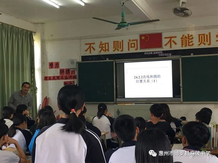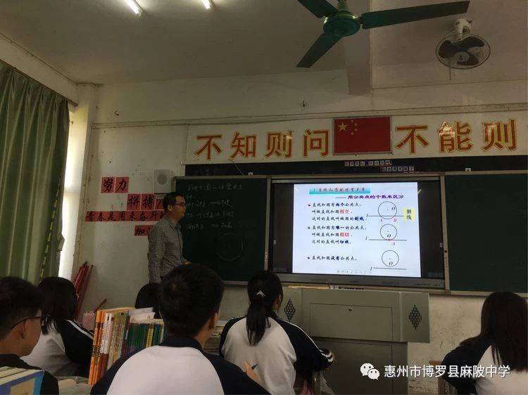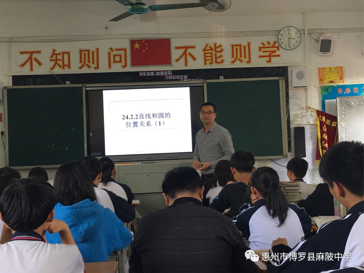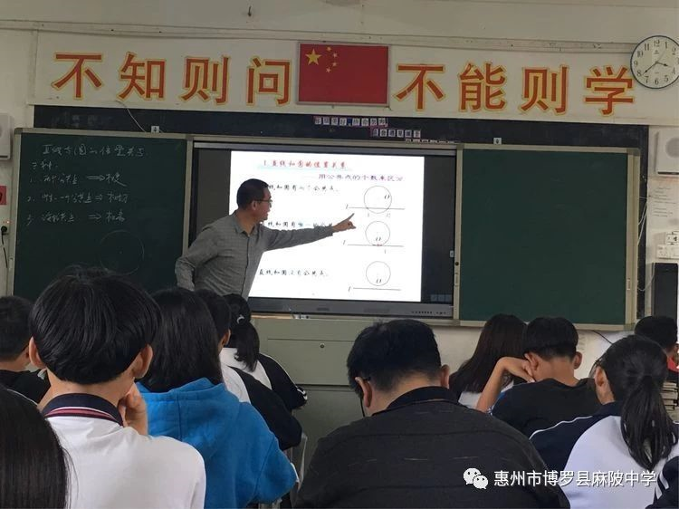 第一环节,深入课堂听课。授课者李鸿安是麻陂中学一个经验丰富的教师,授课内容是九年级上册《直线和圆的位置关系》。李老师将生活与数学有机的联系起来,以太阳从地平线上升的运动过程导入,将上一节课的知识点"点和圆的位置关系"与本节课的教学内容"直线和圆的位置关系"很好的衔接在一起,生动且切合学生认知水平,使得本节课的教学有了一个完美的开端。李老师以从容的教态、扎实的教学功底、巧妙的教学设计、生动有趣的教学方法以及超强的亲和力,深入浅出地引导学生动手动口,一步步达成教学目标,整节课高潮迭起,课堂教学效率较高。