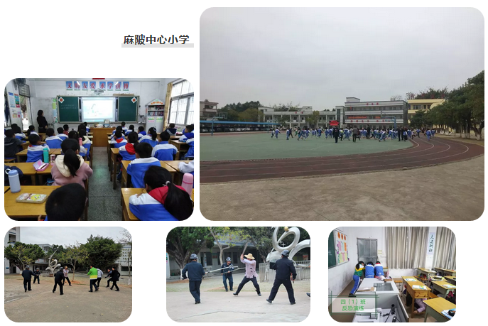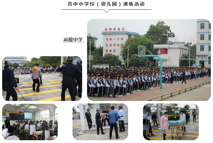 为了预防和减少校园内暴力事件的发生,全力提高各中小学校(幼儿园)处置暴力事件的应急能力,加强中小学校(幼儿园)反恐防暴处置工作。2019年2月18日,新学期开学首日,麻陂镇各中小学校(幼儿园)的全体师生开展了以反恐防暴为主题的演练活动。麻陂镇政府、麻陂派出所、麻陂卫生院等单位参与此次演练活动。
