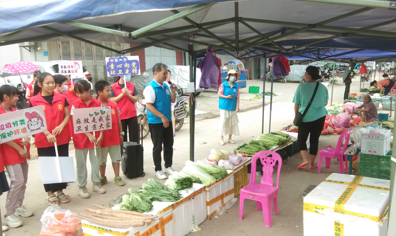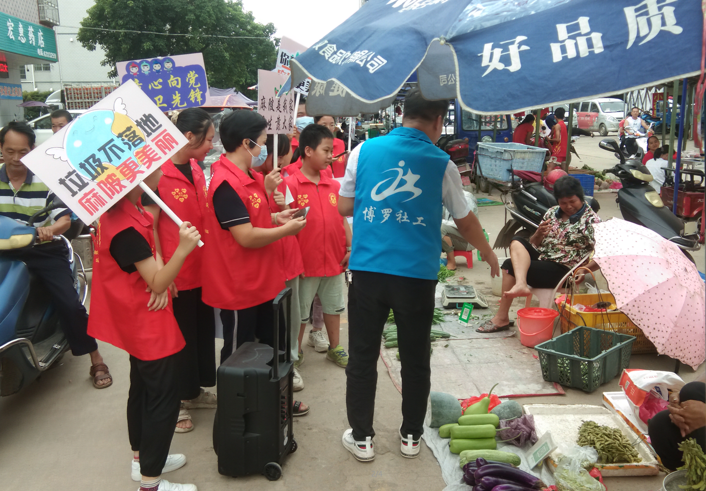 为了进一步做好迎接文明城市测评准备工作,持续推动麻陂社区市场周边和临时摆卖区解决垃圾不落地问题,提升市场及周边环境卫生提质增效,7月19日至21日,幸福社工麻陂社区“三社联动”社工站、社区环卫宣传志愿服务队、青少年先锋志愿服务队和“三社联动”志愿服务队志愿者约50人,对市场周边和临时摊档主开展环境卫生宣传。