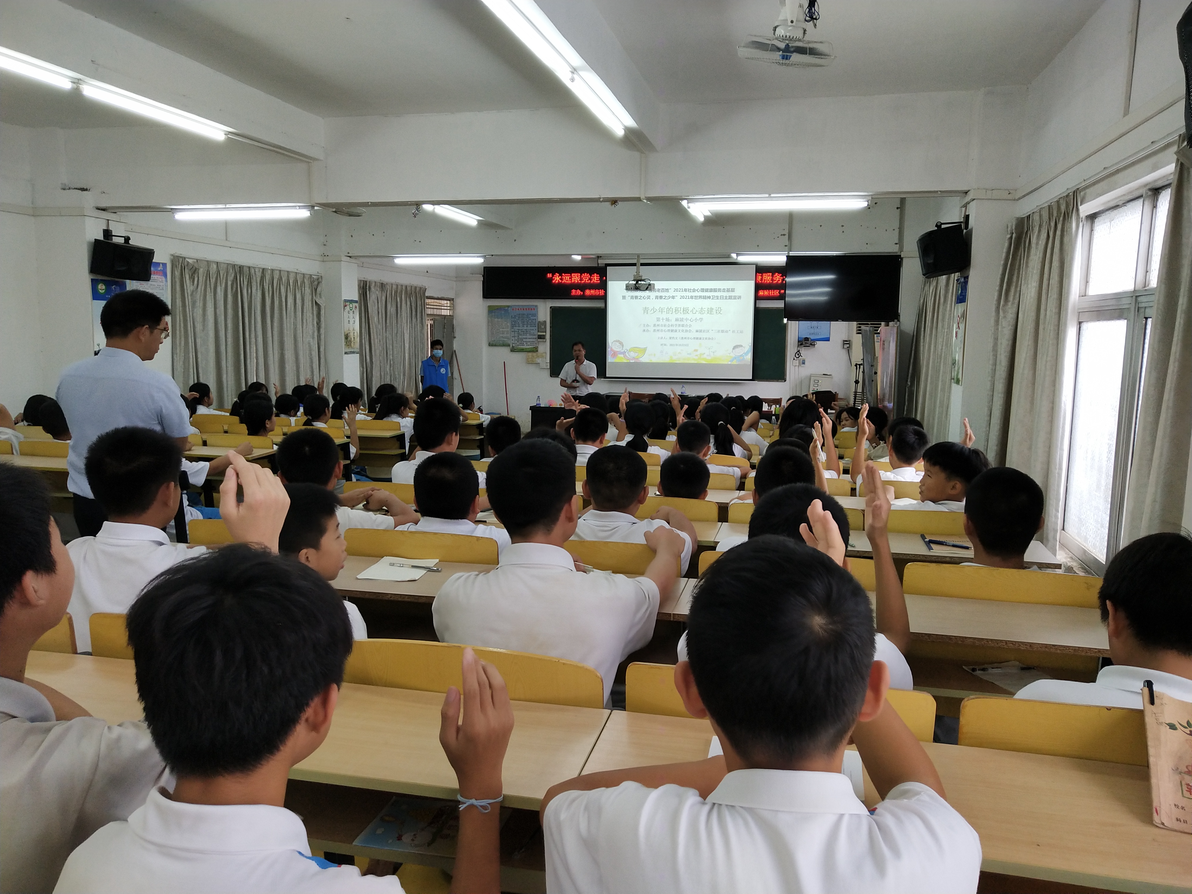 在活动中,梁灼文讲师以青少年喜闻乐见的中国古典人物故事为线索,通过心理视图、物象化、情境化等具体形象引入互动话题,引导同学们用积极、正面的方式面对青春期所面临的压力和困扰。在场的同学们认真听讲,踊跃举手,积极参与到互动体验中。