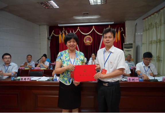 镇党委书记陈慧芬向新当选镇长张国平颁发当选证书