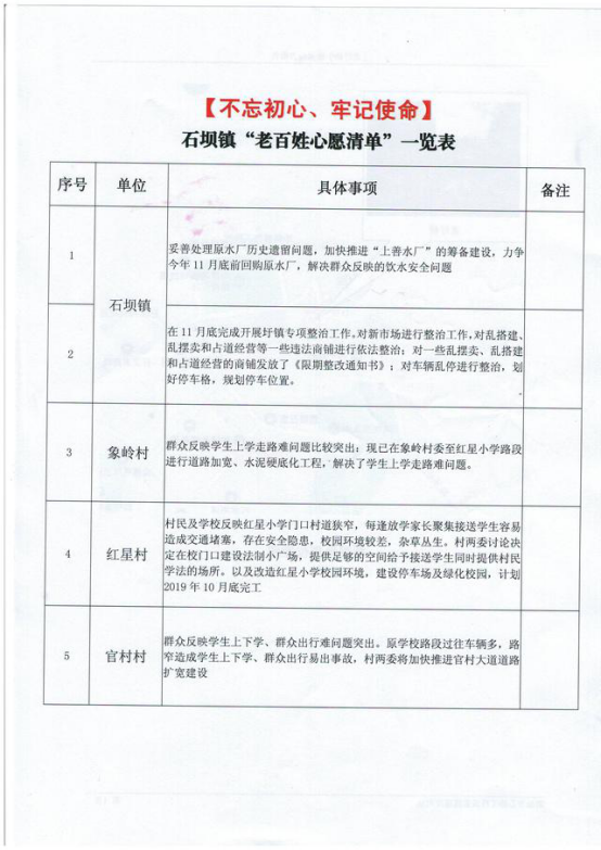 为确保“不忘初心、牢记使命”主题教育工作取得实效,石坝镇通过“一排二听三言四应五做”5步走,全镇齐发力,力争在主题教育期间为老百姓交上一份满意的答卷。