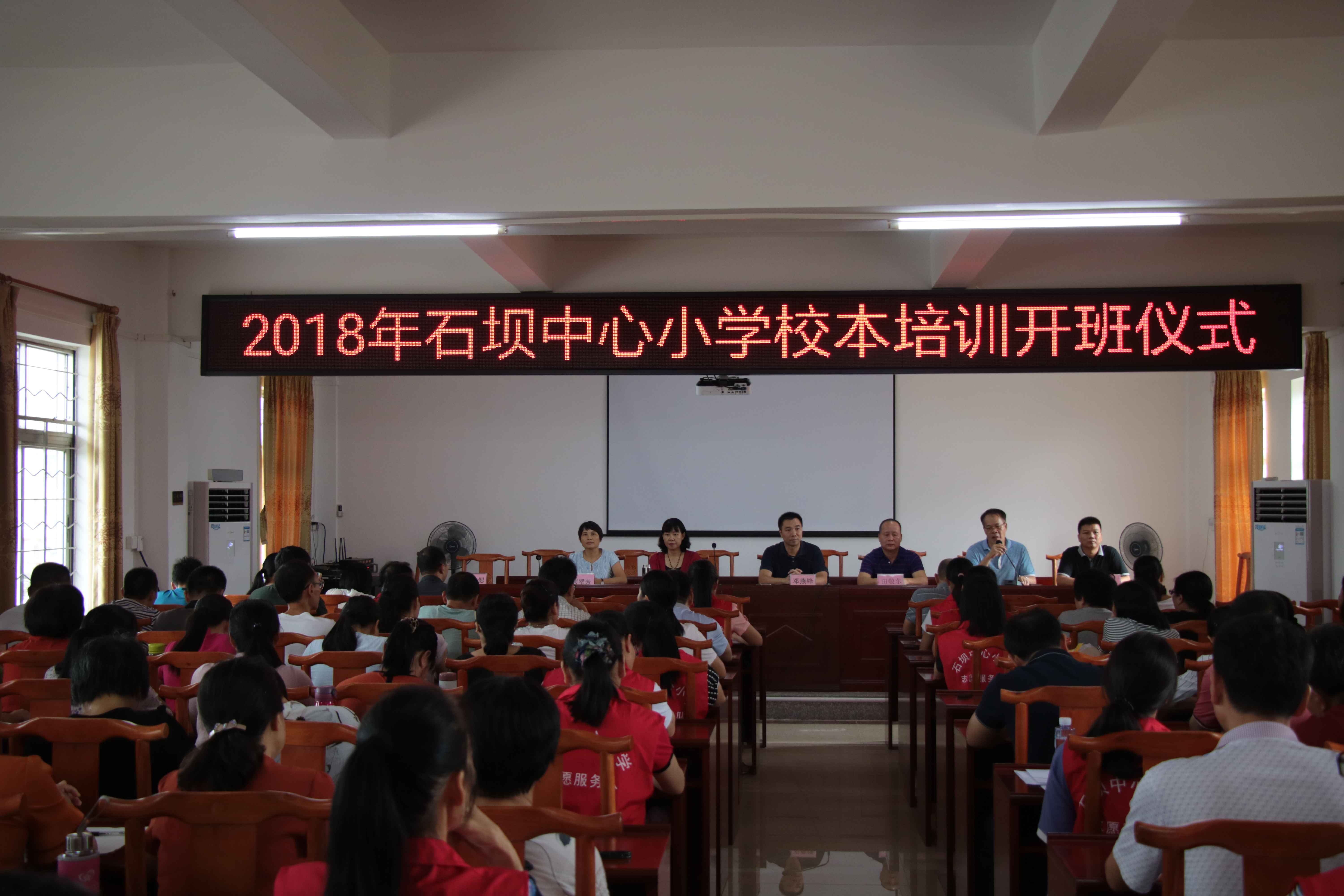 2018年8月28日上午,石坝中心小学校本培训在镇人民政府老办公楼三楼会议室正式开班。镇党委书记邓燕锋同志、镇人大主席田敬东同志参加本次开班仪式并发表重要讲话。开班仪式上,邓燕锋同志对广大教师提出了有担当、重团结、常感恩、怀爱心、当明星的五点殷切希望,得到了广大教师的深切认同。同时,11名志愿者教师共同朗诵了习主席的《不忘初心》。最后,以“智慧教师”、“教室底线”、“终身成长”、“美乐教育,幸福课堂”为主题的培训活动正式开始。