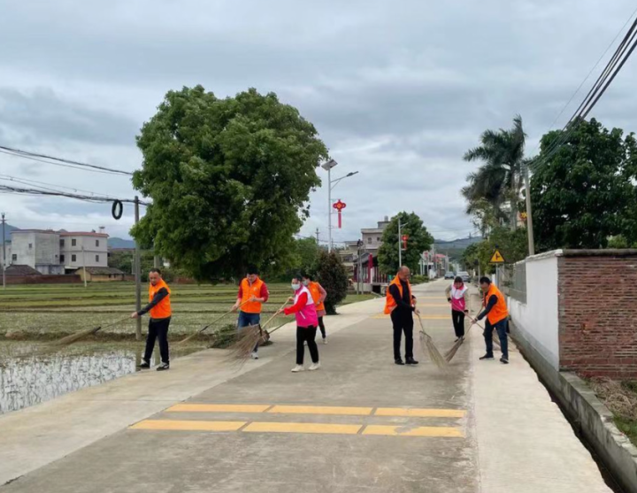 石坝镇党员干部、志愿者等清扫道路。