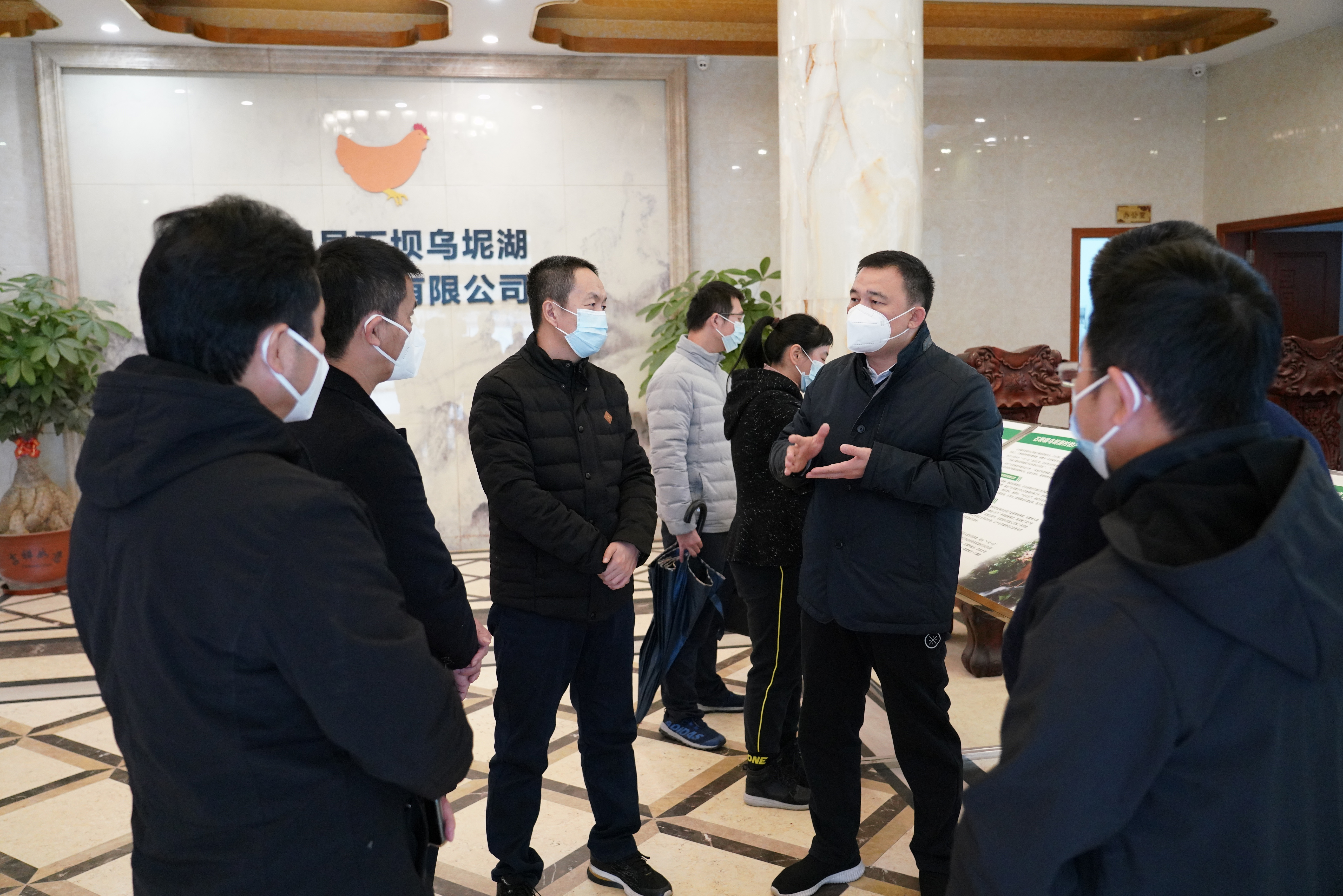 ▲调研组一行在石坝镇思源养殖有限公司调研三黄胡须鸡产业发展情况