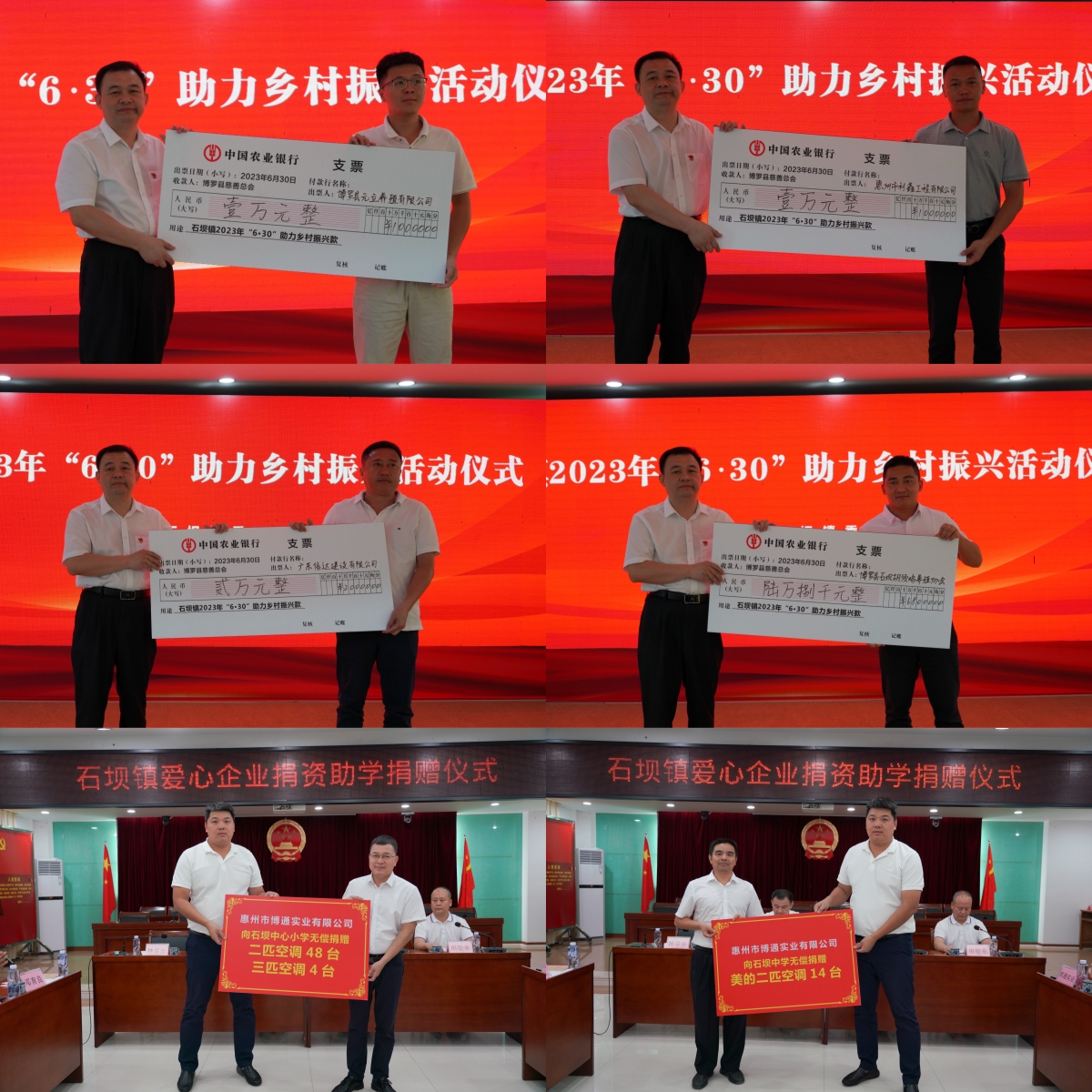 爱心企业在行动,做深做实村企结对帮扶,捐资助学暖人心,今年以来,“6·30”助力乡村振兴活动中,全镇共募集善款超17万元,其中20多家热心企业和社会热心人士捐款近14万元;“万企兴万村”行动中,骏旺、众原、粤电惠博、建农、思源、元立、福和、博通等40多家爱心企业为支持教育事业、儿童节慰问、高考优秀学子助学金等捐赠金额超14万元、捐赠空调66台。