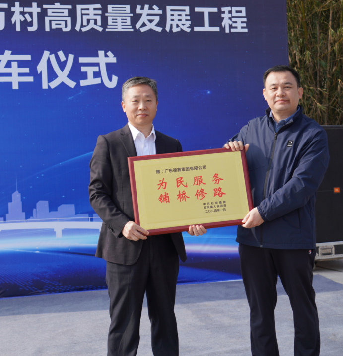 ▲镇党委书记黄作林向广东德赛集团赠予感谢牌匾,广东德赛集团高级经理张留根代表接受牌匾