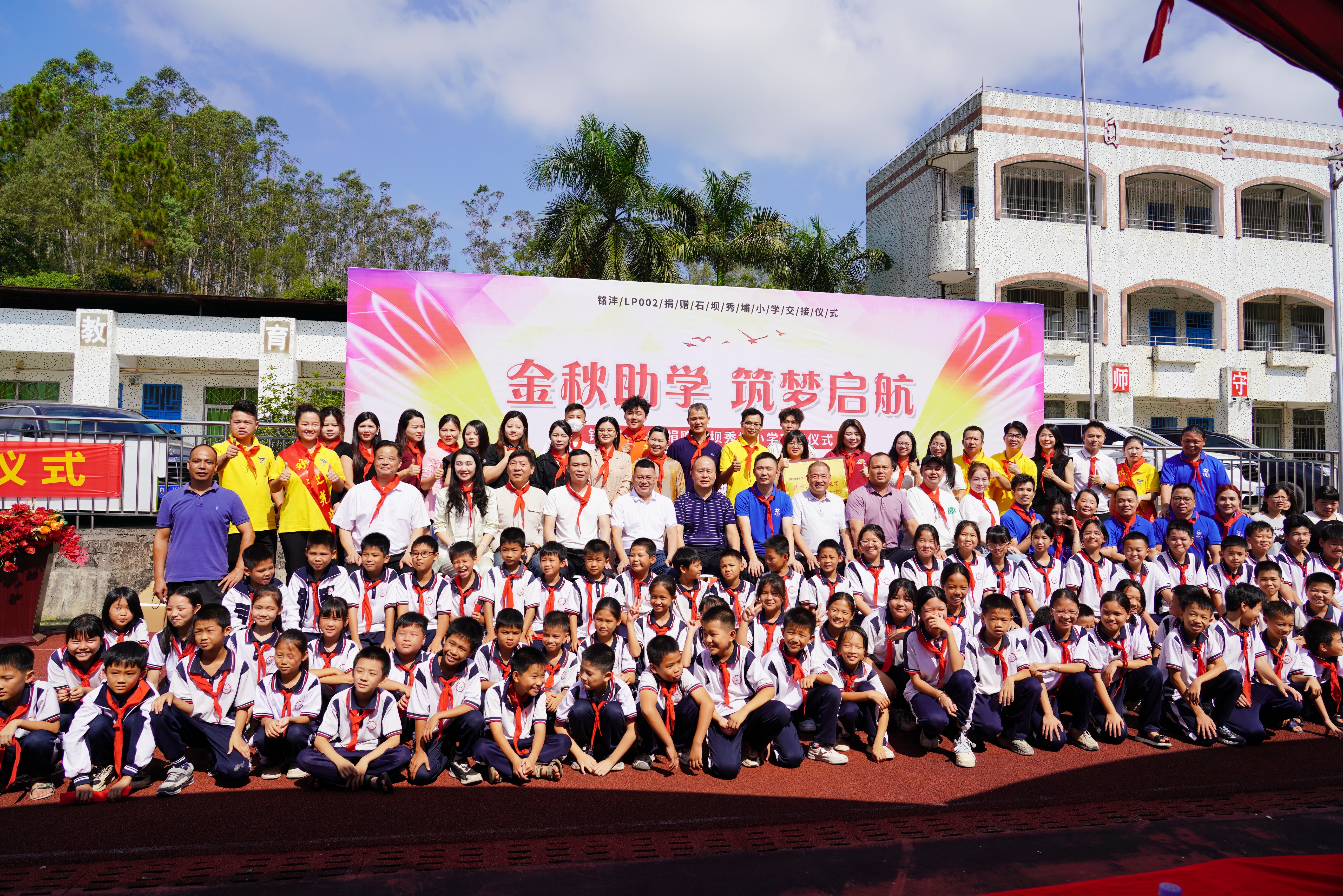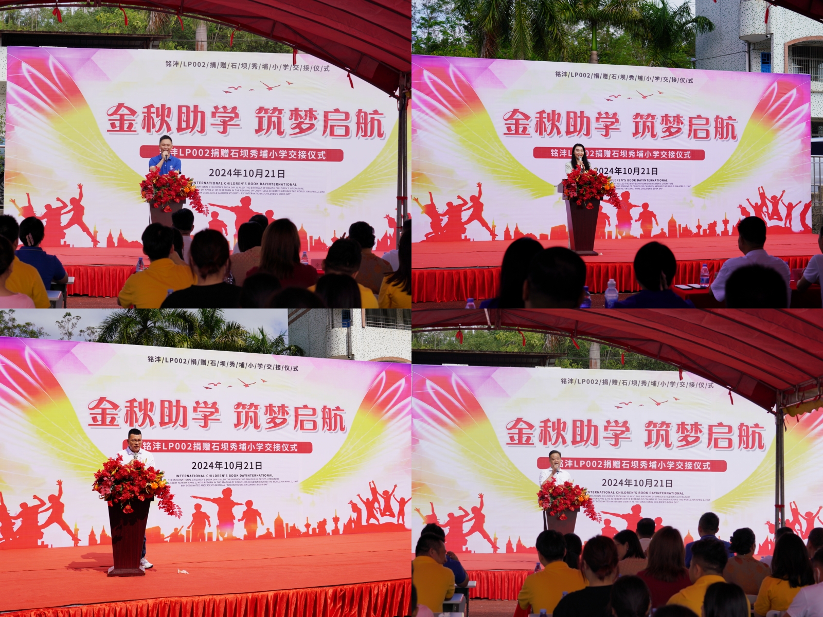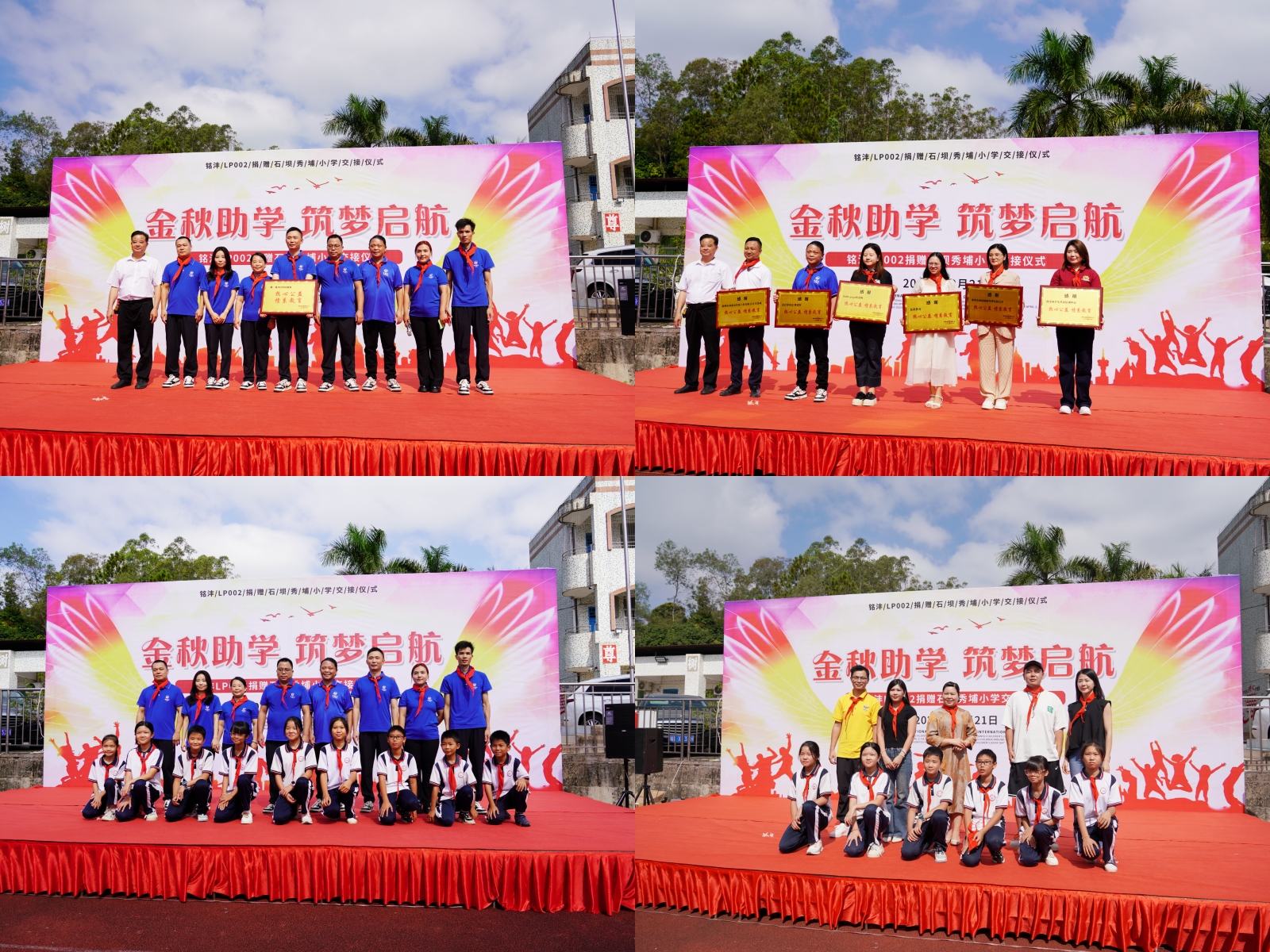 活动中,石坝秀埔小学与铭沣LP002团队进行了捐赠交接仪式,校方为爱心团队颁发了牌匾并由少先队员代表为他们系上红领巾。铭沣LP002团队代表先后致辞表示,希望通过此次捐赠,为学校改善教育教学条件提供支持和帮助,创造更好教育教学和学习成长环境,同时希望同学们能够将关怀转化为勤奋,奋发图强,用实际行动回报社会。