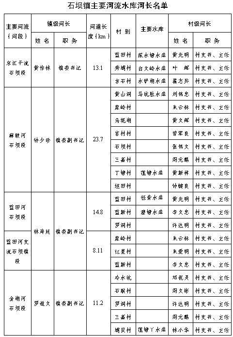 为进一步加强石坝镇河长制的组织工作,经镇党委、镇政府同意,决定对石坝镇总河长及主要河流河长作适当调整(详见附件)。现将调整后的石坝镇总河长及主要河流河长名单印发给你们,请结合实际认真抓好贯彻落实。