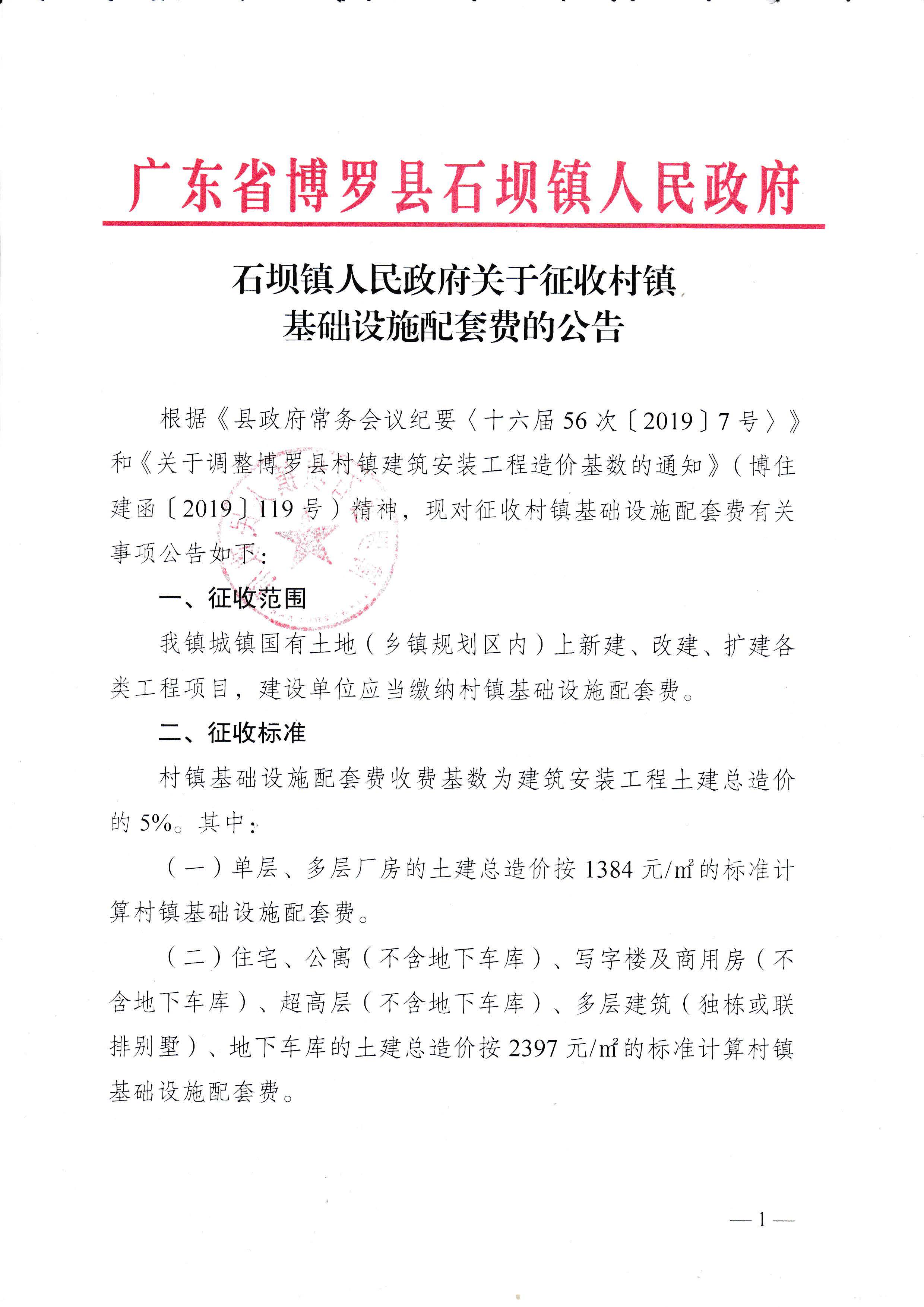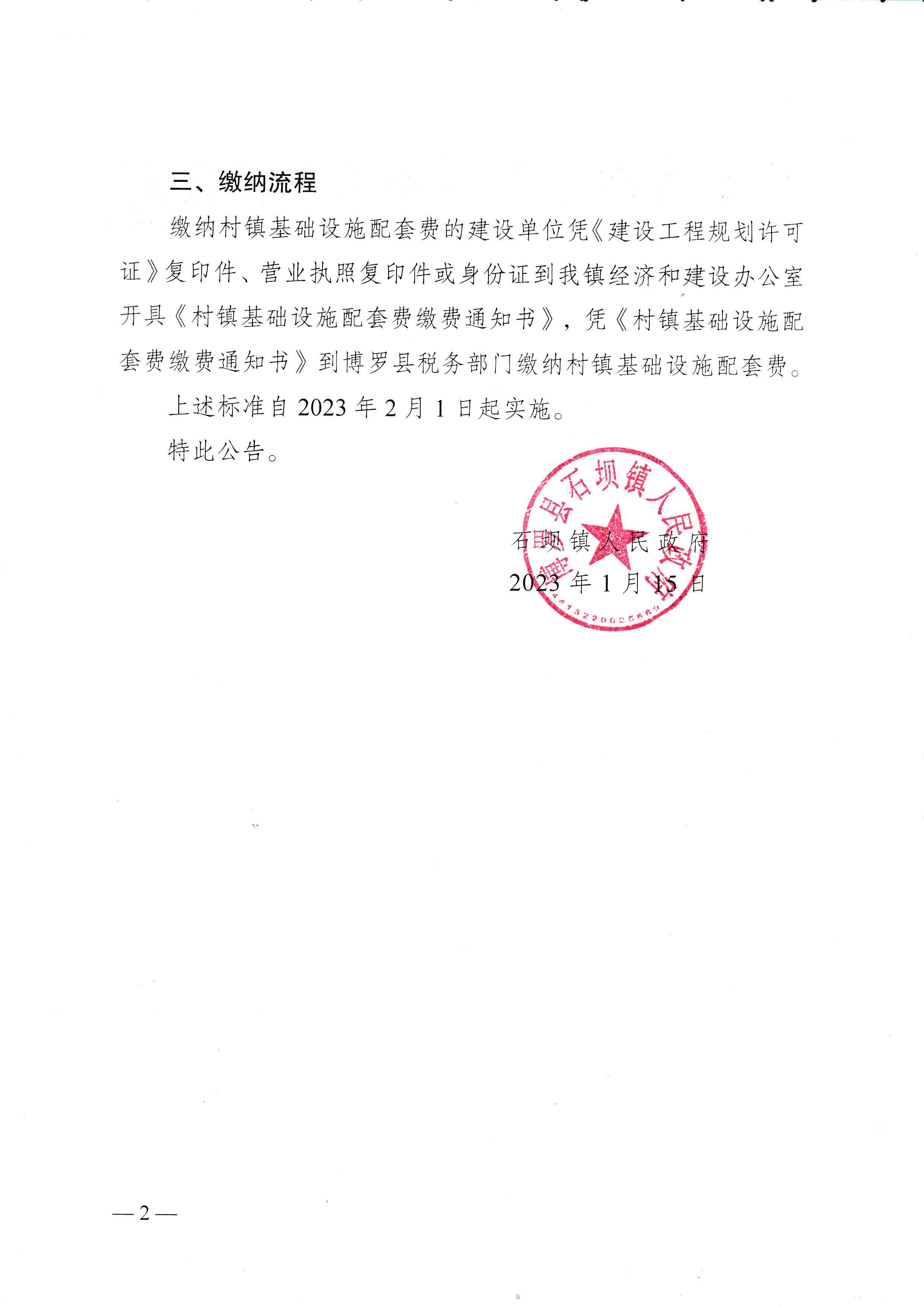 石坝镇人民政府关于征收村镇基础设施配套费的公告