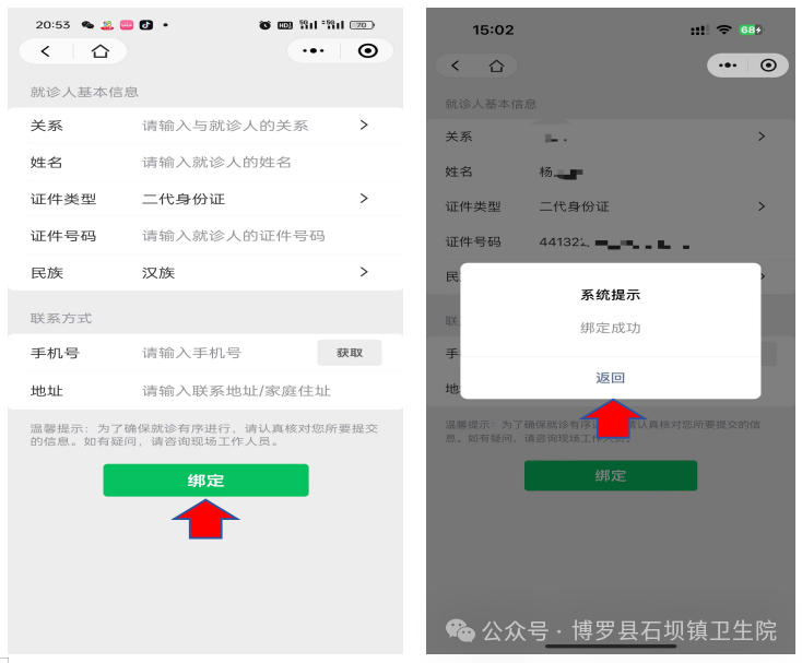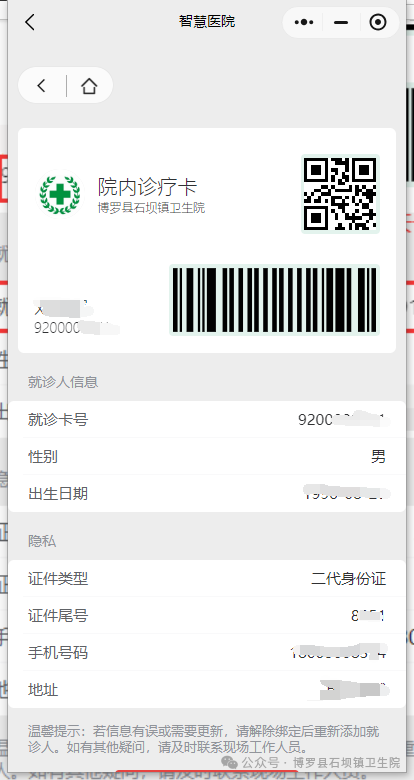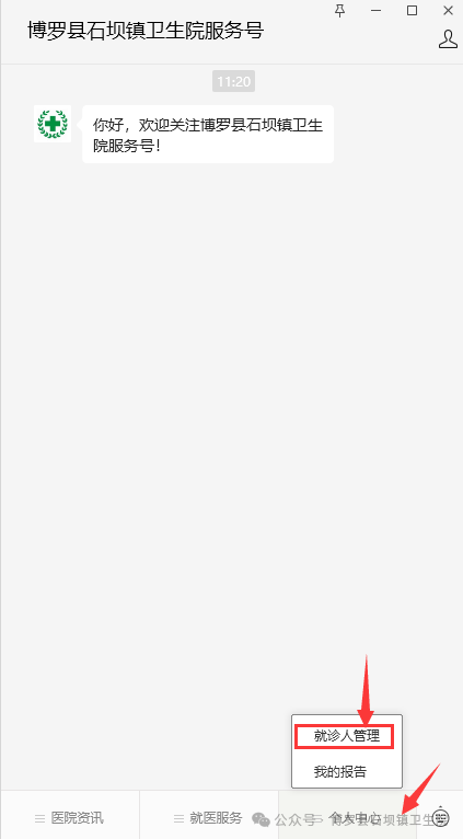 第二步:进入《石坝镇卫生院服务号》页面,点击个人中心、就诊人管理进行绑卡办卡。