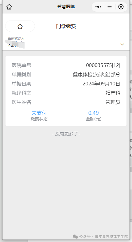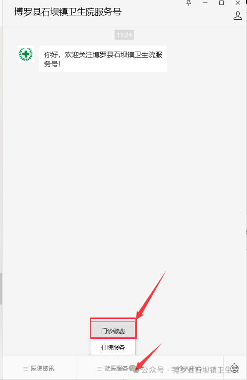 第一步:进入《石坝镇卫生院服务号》页面,点击就医服务,选择门诊缴费
