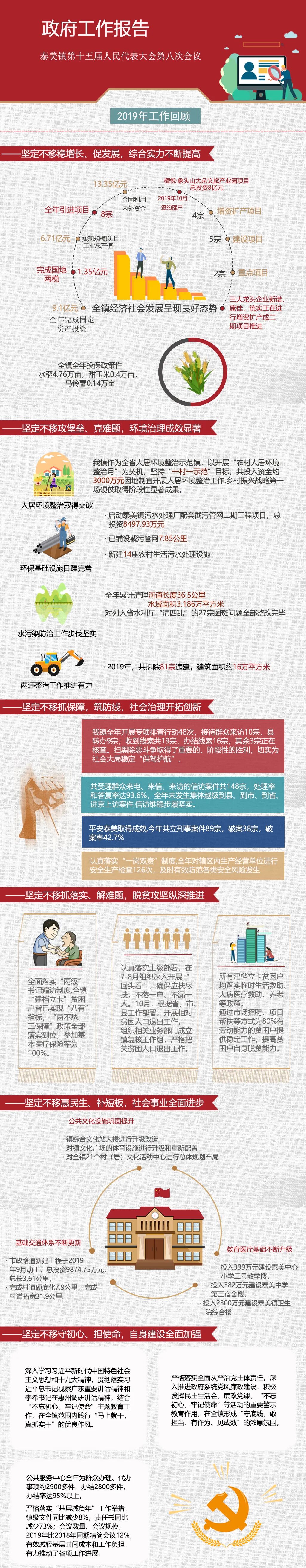 2020年5月15日,在庄严的国歌声中,泰美镇第十五届人民代表大会第八次会议在镇政府三楼会议室召开,县人大常委会副主任张学文同志到会指导。来自全镇各行各业、各条战线的62名人大代表肩负使命、齐聚一堂,听取审议了《政府工作报告》《人大工作报告》《中文博彩平台泰美镇镇区、工业集中区控制性详细规划(草案)》等报告,讨论、酝酿了镇长、镇人大主席、副镇长候选人。现在,跟小编一起看看泰美镇在2020年将如何发力,迈向高质量发展,持续增进民生福祉,增强居民幸福感?带你图个明明白白~↓↓↓