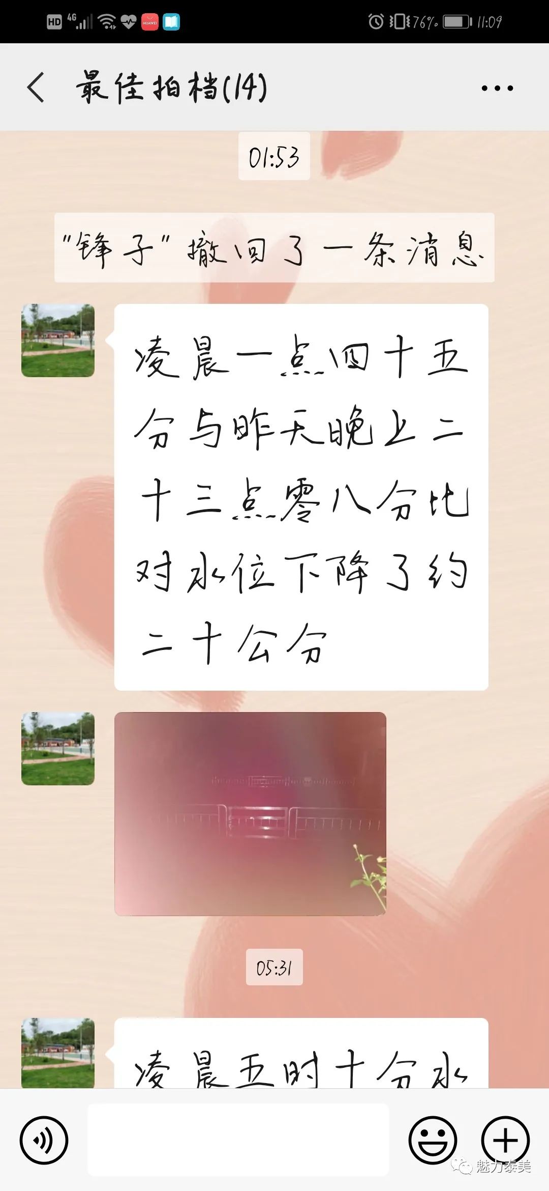 “凌晨一时四十五分与昨夜二十三点零八分对比水位下降了约二十公分”、“凌晨五时十分水位”.....一条条消息不断出现在车村村两委干部工作群“最佳拍档”中弹出,文字伴随着图片一起,详细地记录了车村村水位的变化。