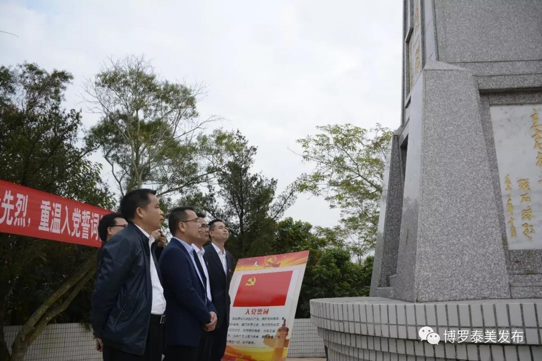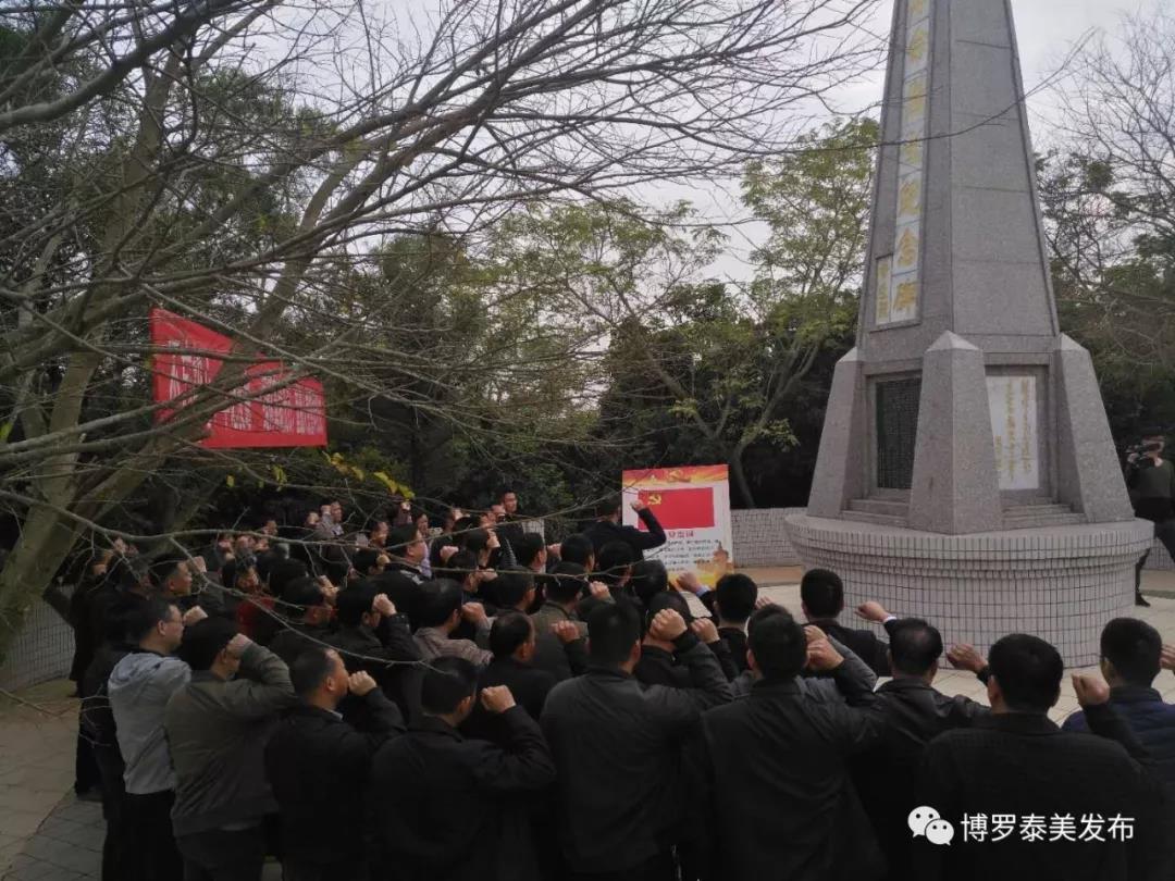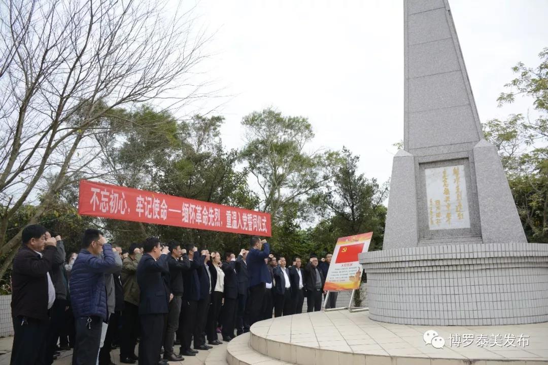 随后,镇三套班子领导成员,副科级以上领导干部,镇属各部门负责人,各党支部书记,各党支部预备党员一行来到泰美革命烈士纪念碑前,举行“不忘初心·牢记使命”——缅怀革命先烈,重温入党誓词仪式。在镇党委书记黄海聪的带领下,大家面对党旗,举起右手,紧握拳头,重温入党誓词。