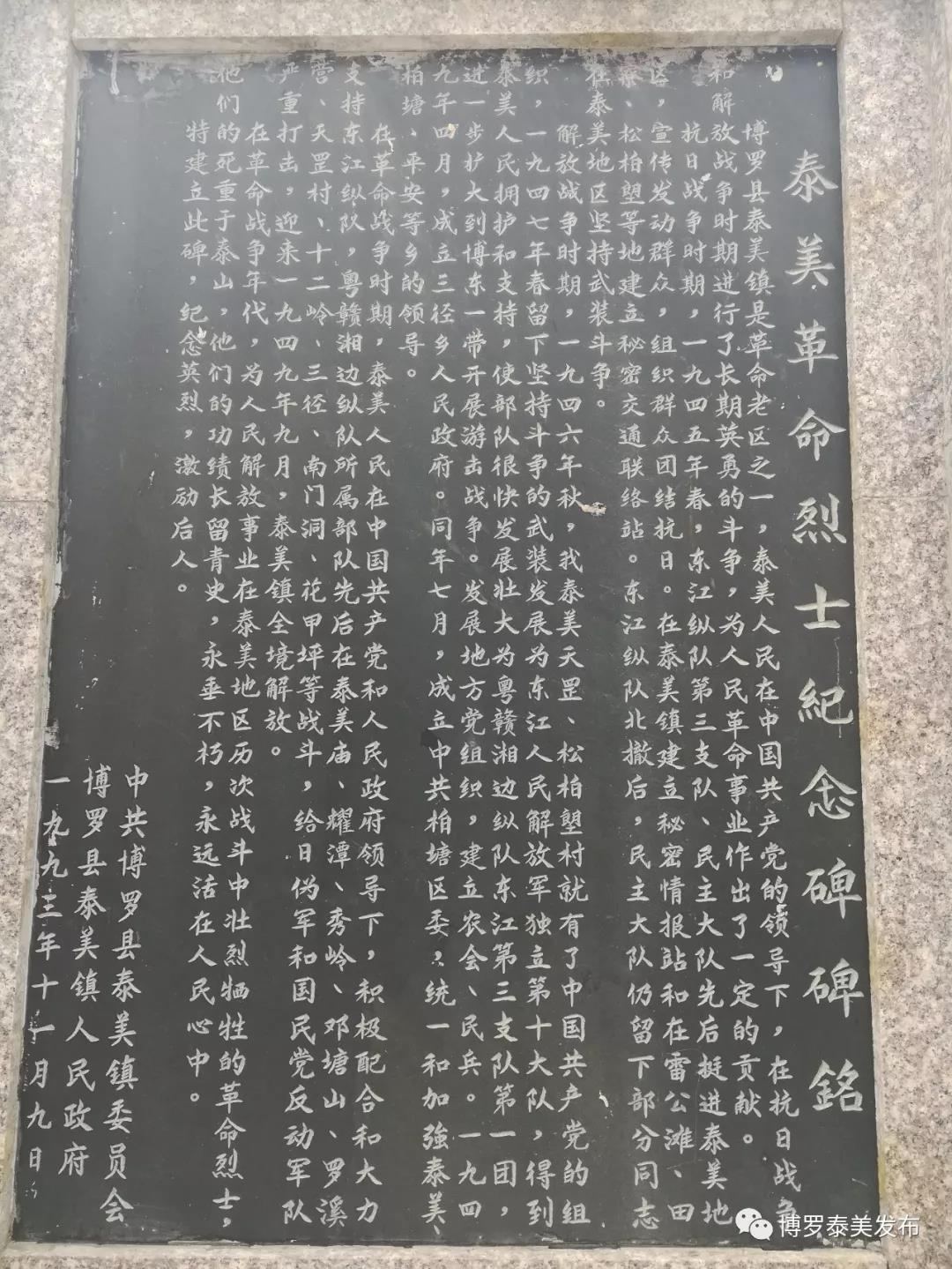 泰美镇是革命老区,泰美人民在共产党的领导下,在抗日战争和解放战争时期与敌人进行了长期英勇的斗争,为解放事业作出了一定的贡献。为纪念在泰美地区历次战斗中壮烈牺牲的革命烈士,于1993年建立了此碑,纪念英烈,激励后人。