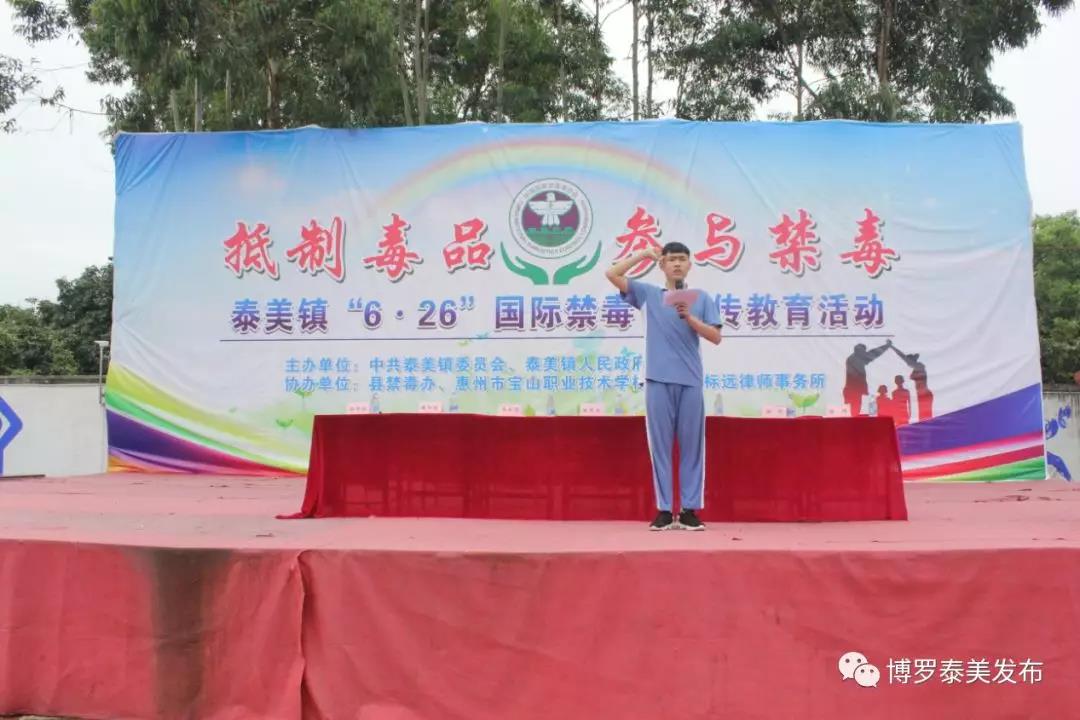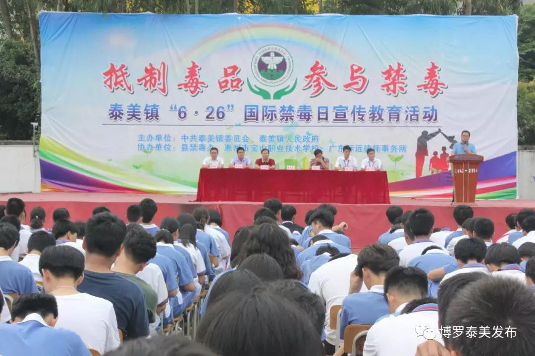 在“6.26”国际禁毒日来临之际,为进一步加强毒品预防教育,切实增强在校学生对毒品危害的认知和提高抵御毒品的能力,有效防止和减少学生感染毒品,确保学生健康成长。泰美镇于6月22日,在惠州市宝山职业技术学校开展“6.26”国际禁毒日宣传教育活动,中文博彩平台禁毒办、泰美镇禁毒办、泰美派出所、泰美司法所、广东标远律师事务所等单位参加活动。