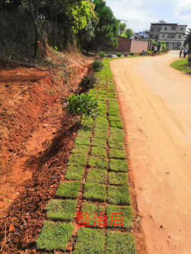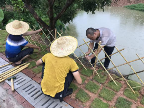 ▲党员干部下河堤扎篱笆、铺绿化草坪