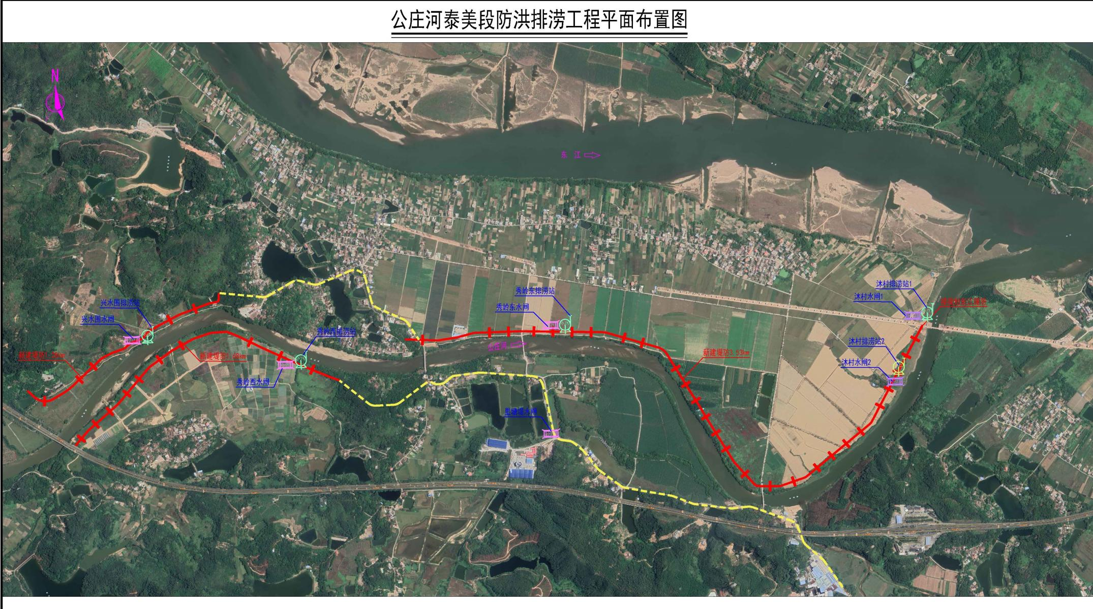 本项目位于泰美镇北部,两边分布芹塘村、兴水围村、秀岭村、沐村村、罗福田村等村庄,建设内容包括公庄河(泰美段)新建堤防6.5km,其中左岸4.8km,右岸1.7km;新建排涝站5座,新建水闸6座。本项目总工期约为2年。计划投资人民币约19500.00万元。