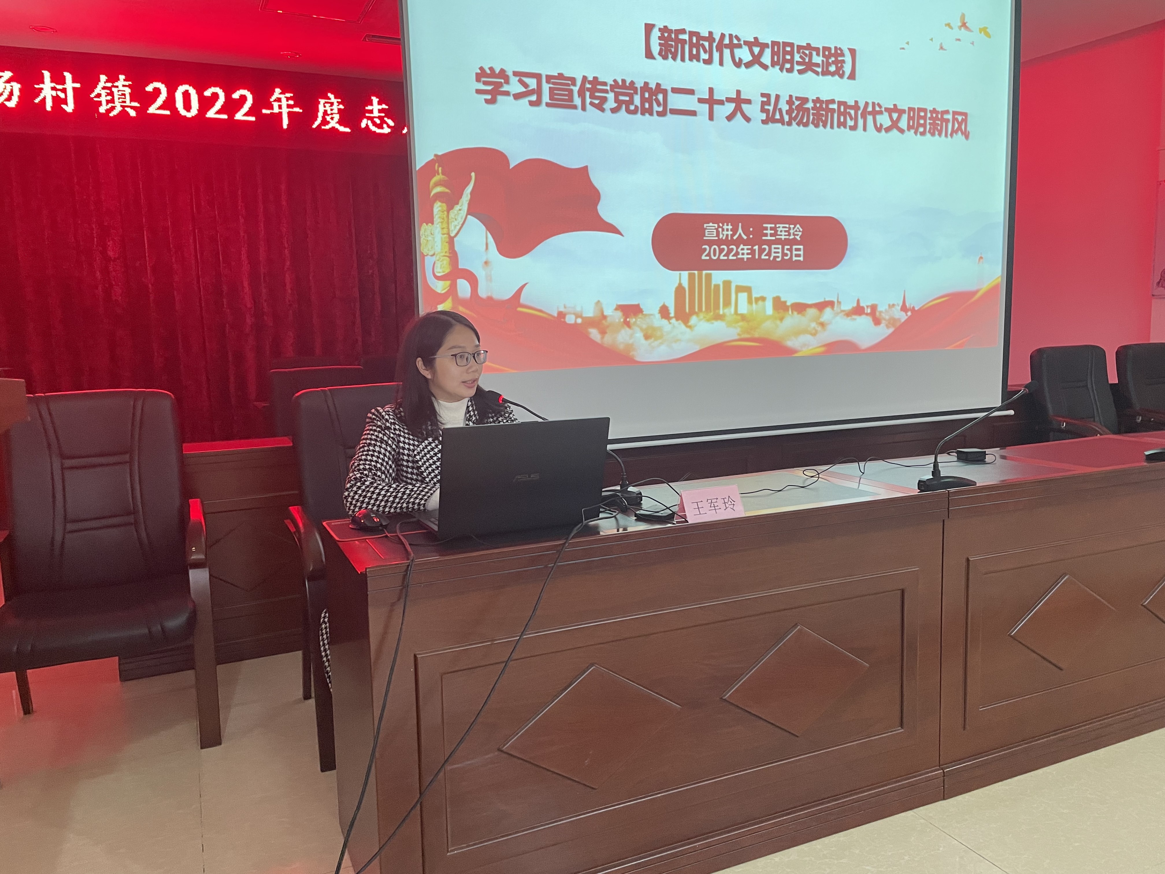 会上,王军玲就党的二十大精神作了专题宣讲。王军玲指出,新时代下杨村各个志愿服务队已成为建设美丽杨村的一份重要力量,优秀志愿者们要大力弘扬党的二十大精神,再接再厉,将志愿服务的温暖带到杨村的各个角落。