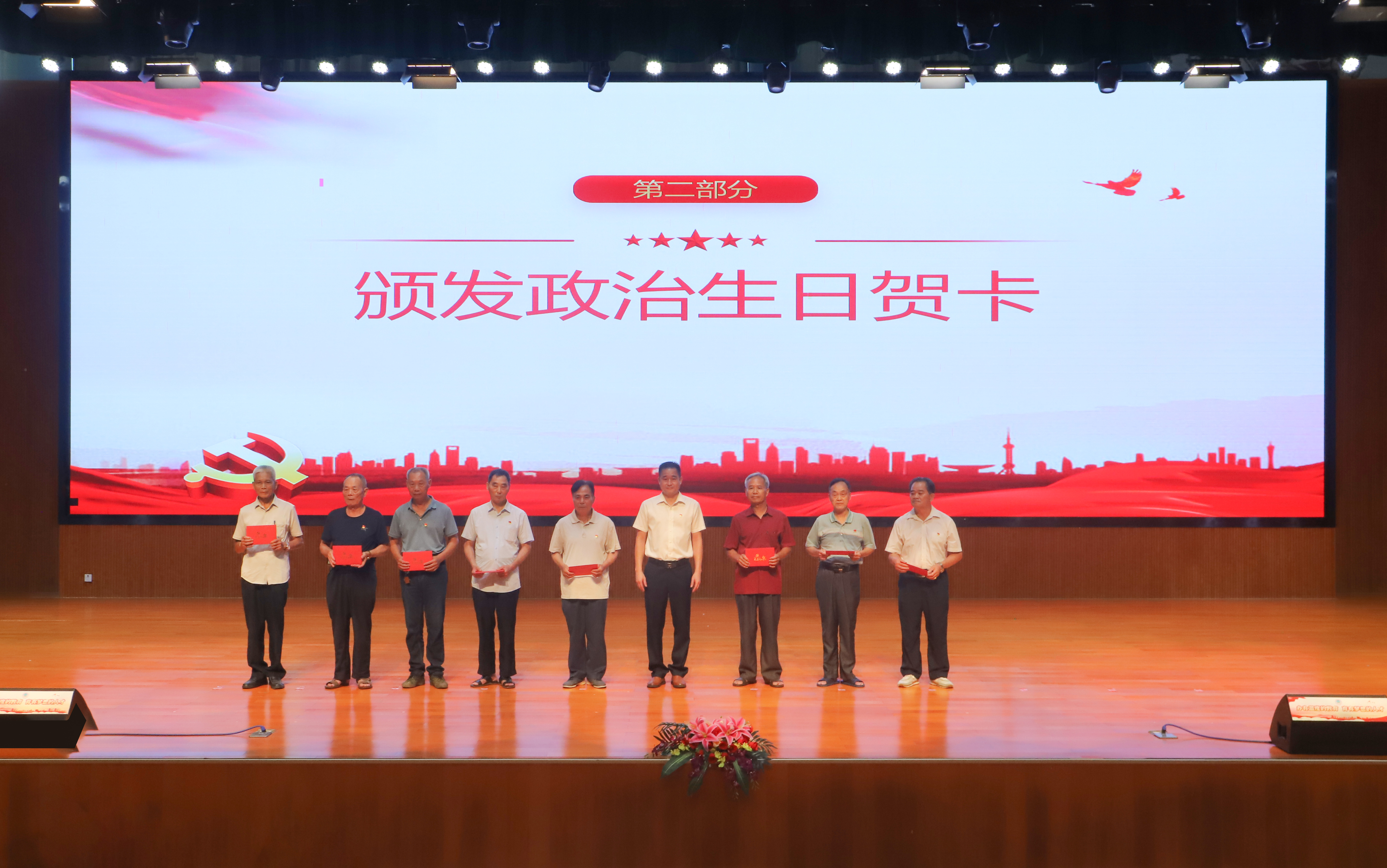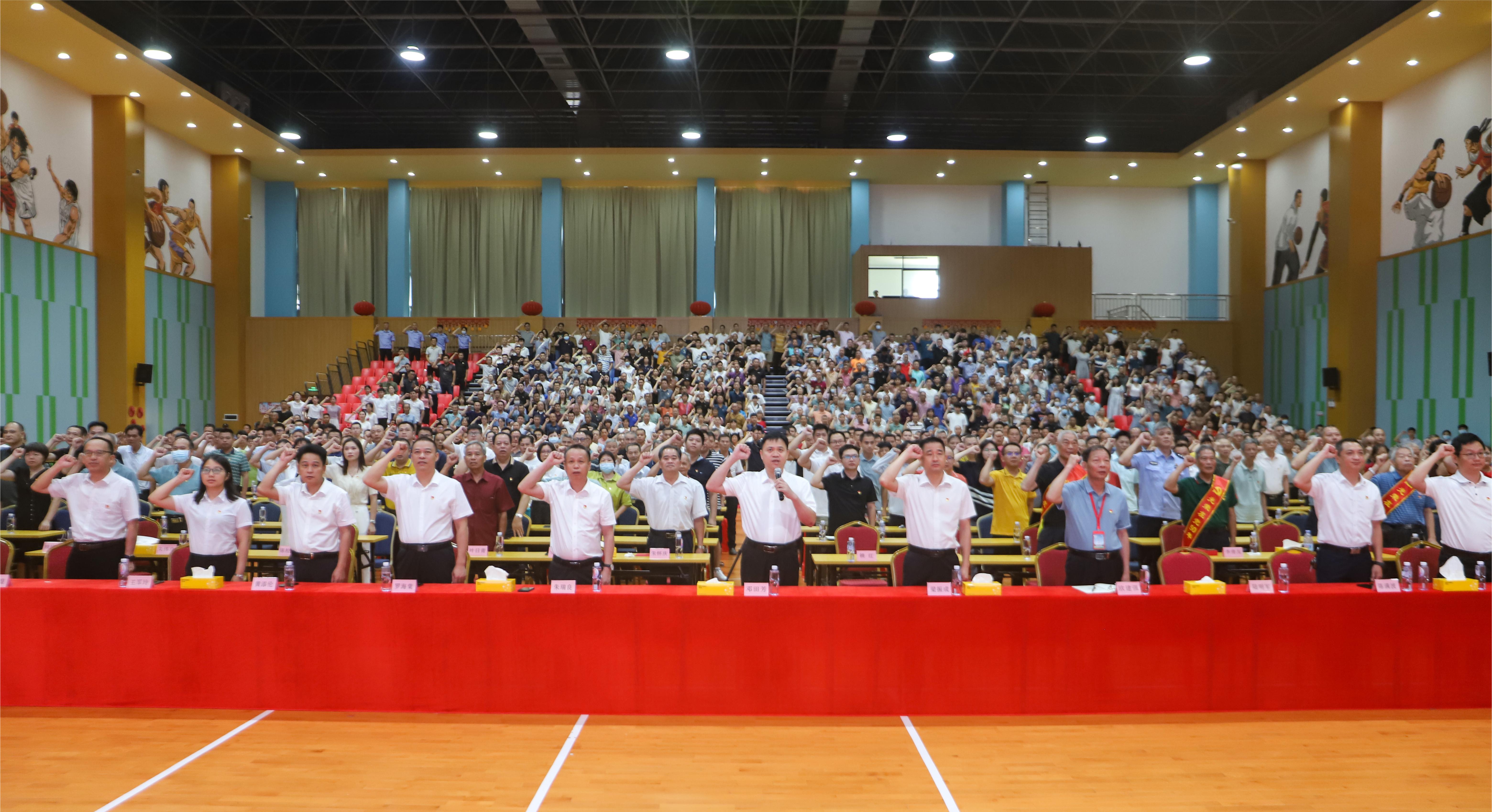 镇党委书记邓田芳带领全体参会党员重温入党誓词,并为3名老党员颁发“光荣在党50年”荣誉勋章;镇党委副书记、镇长梁振成为8名党员代表颁发政治生日贺卡。
