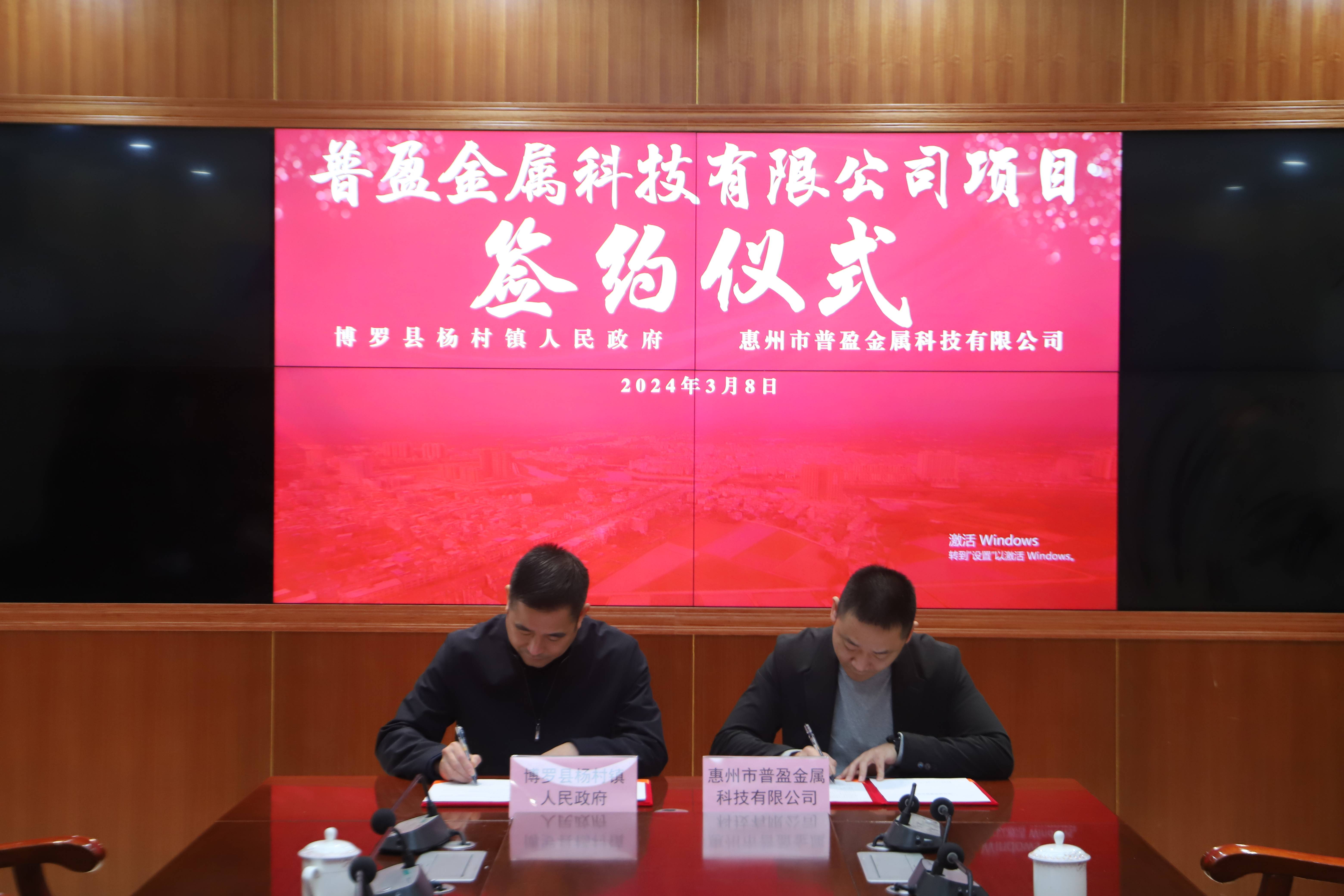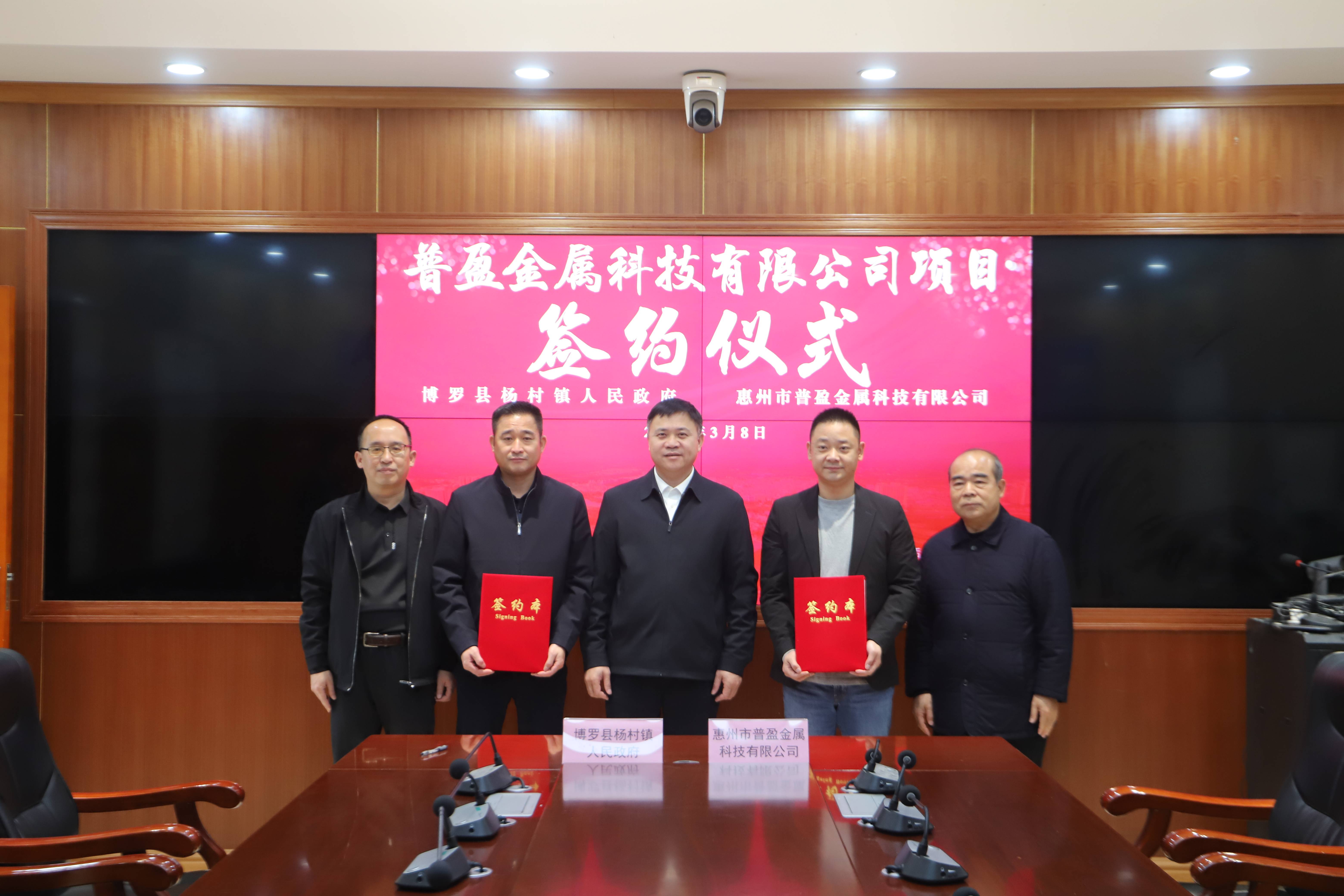 3月8日上午,杨村镇人民政府与惠州市普盈金属科技有限公司在镇政府一楼会议室举行惠州市普盈金属科技有限公司项目签约仪式。镇党委书记邓田芳,镇党委副书记、镇长梁振成,惠州市普盈金属科技有限公司董事长杨超等出席仪式。