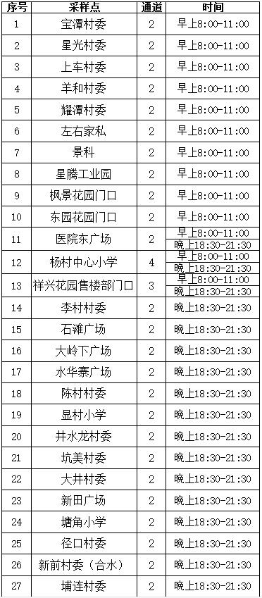 按照市、县统一部署,为做好新冠肺炎疫情防控工作,切实保障人民群众生命健康安全,杨村镇将于10月6日至8日三天开展三轮新冠病毒区域核酸筛查工作,确保应检尽检,不漏一人。全镇共设置27个采样点,请广大居民群众按照通知自行有序前往采样点采样,切勿扎堆。