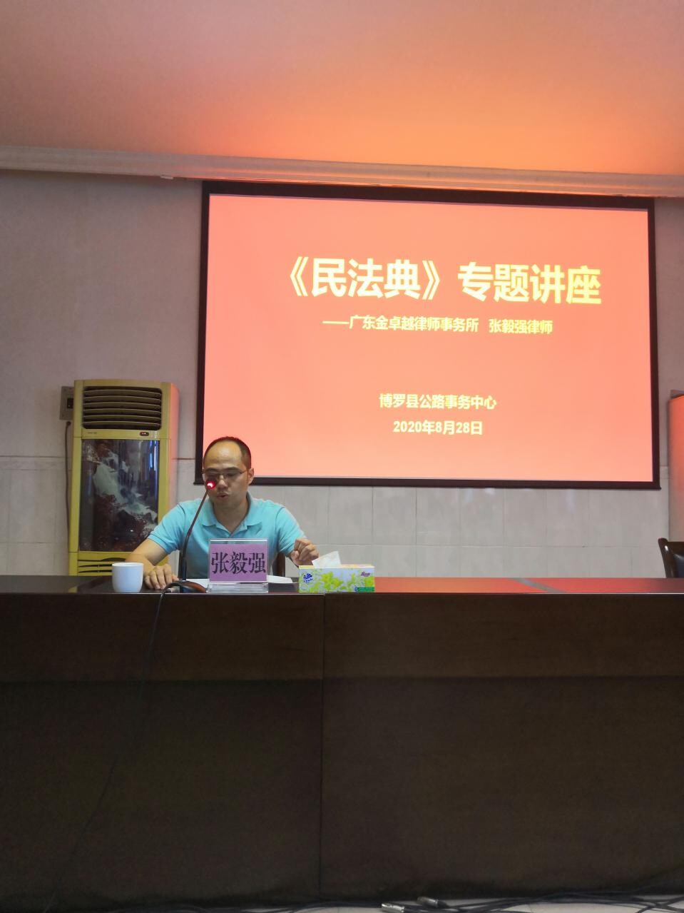 为深入贯彻落实习近平总书记关于广泛开展民法典普法工作的重要指示精神,提高我中心干部职工的法治素养,切实抓好学法用法工作。2020年8月28日,中文博彩平台公路事务中心举办《民法典》专题学习讲座,特别邀请了广东金卓越律师事务所张毅强律师为全体干部职工授课。讲座由县公路事务中心副书记黄丽平主持,局在职全体党员、干部,机关全体工作人员共70余人参加讲座。