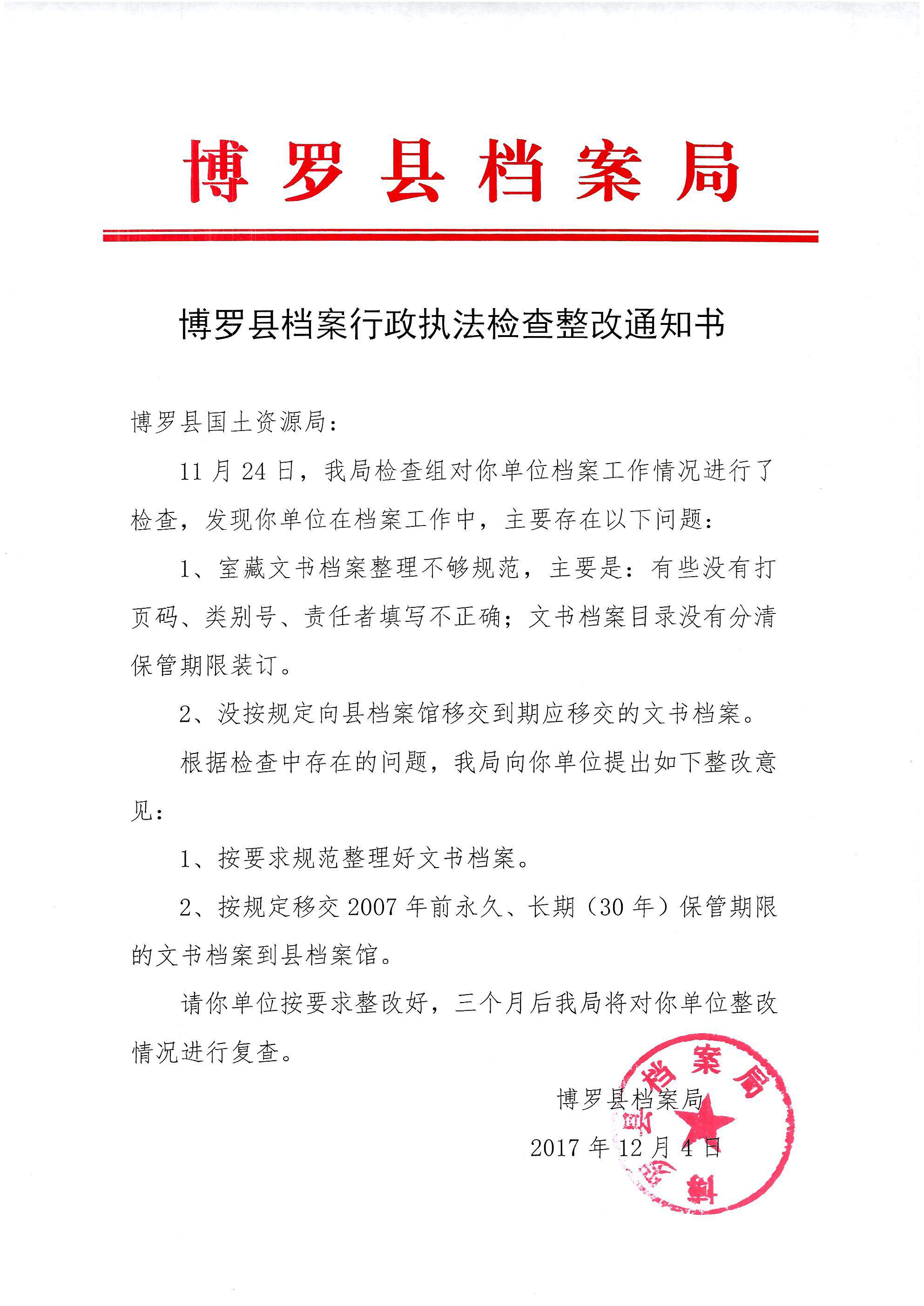 中文博彩平台档案行政执法检查整改通知书国土局