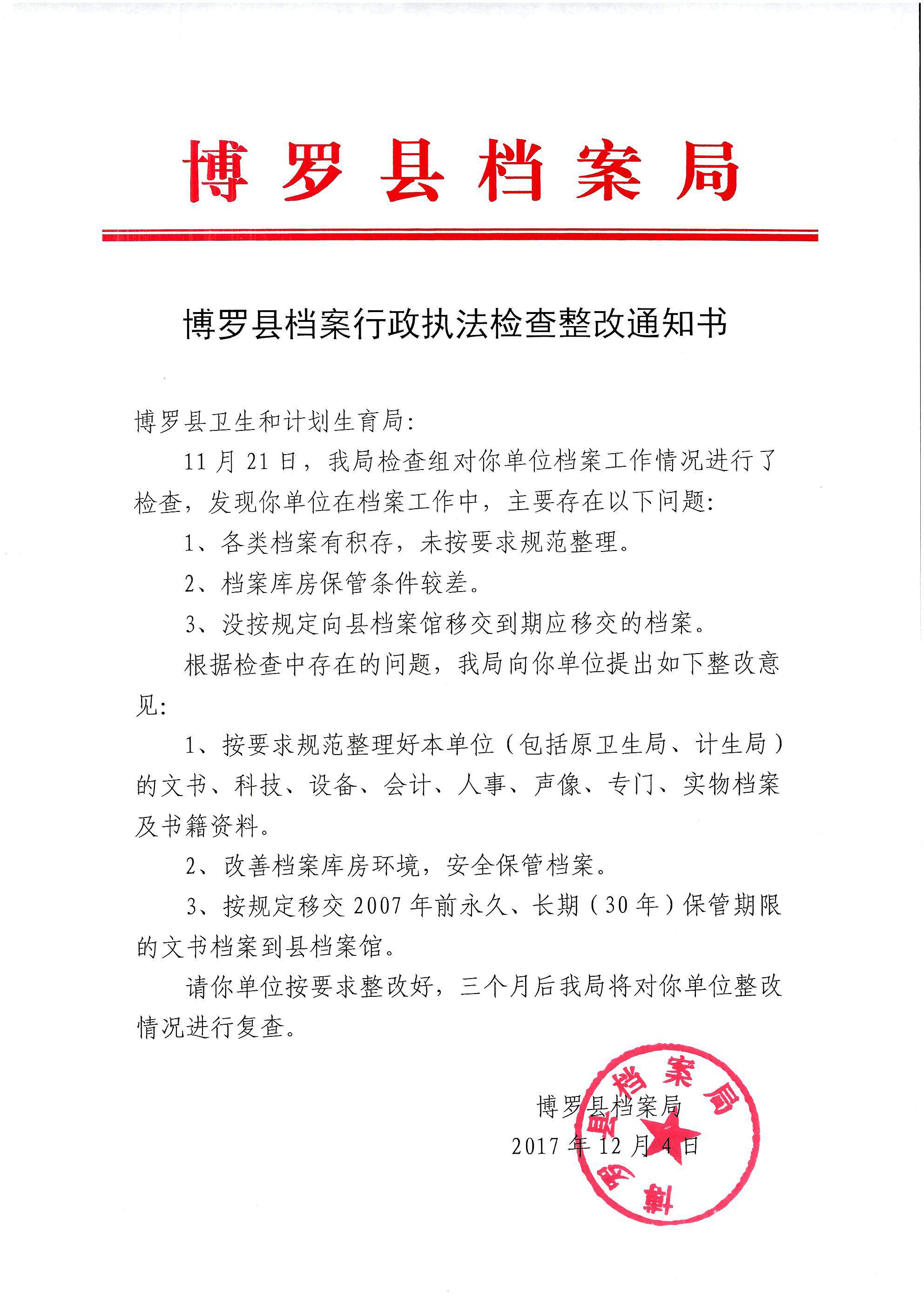 中文博彩平台档案行政执法检查整改通知书(卫计局)