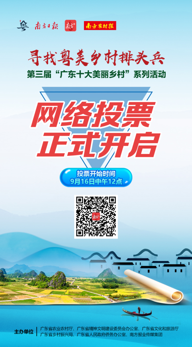 由广东省农业农村厅、广东省精神文明建设委员会办公室、广东省文化和旅游厅、广东省乡村振兴局、广东省人民政府侨务办公室、南方报业传媒集团联合主办的第三届“广东十大美丽乡村”系列活动已进入网络投票环节,投票通道已正式开启!